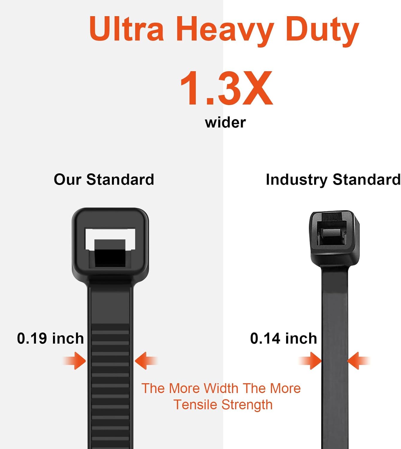 - 【100lb Tensile Strength】: The more width and Thickness, the more tensile strength. our zip ties 12 inch width is 0.19 inch(4.8mm), while industry standard is 0.14 inch(3.6mm), our zip ties 12 inch Thickness is 0.065" inch(1.65 mm), while industry standard is 0.05 inch(1.25mm),more tensile strength.