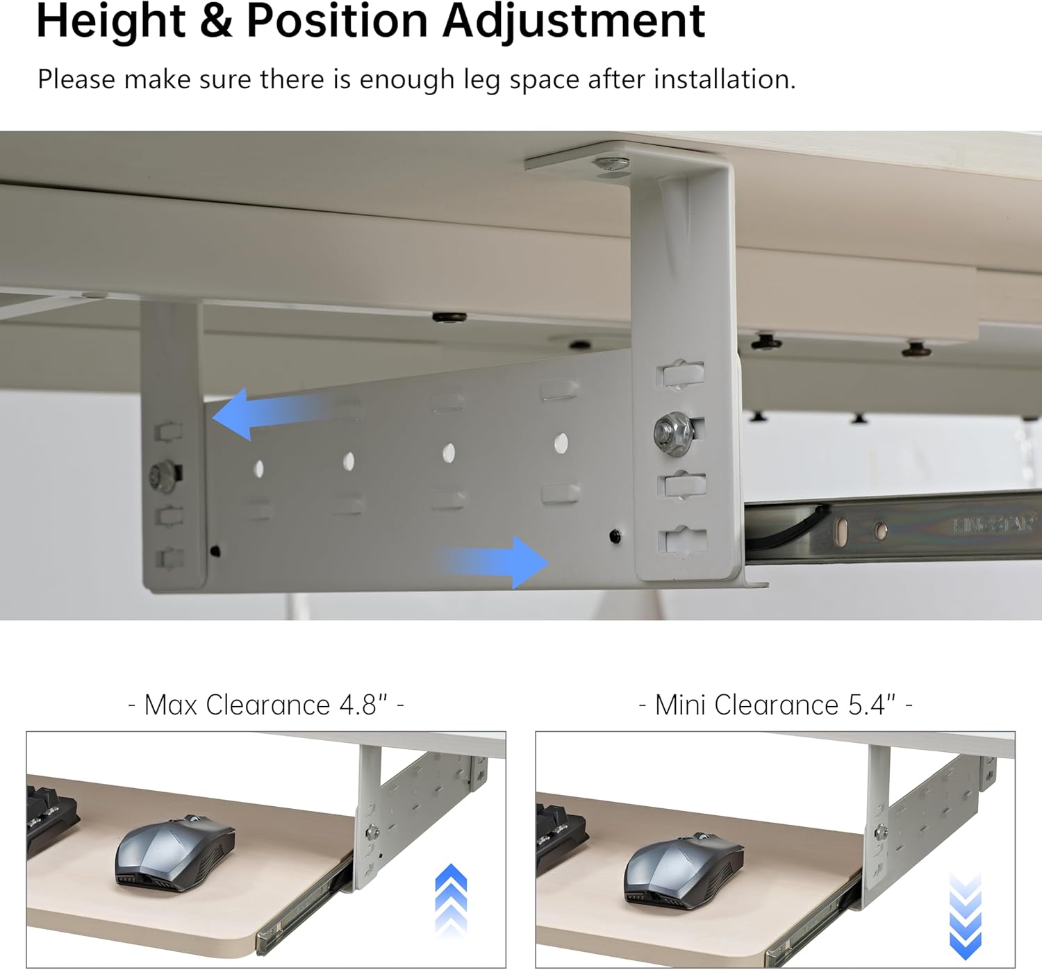- 【Wide Compatibility】: This keyboard drawer is designed to be compatible with a wide range of desks, and is suitable for desktops made of materials such as wood, MDF, or other materials with similar characteristics (not compatible with plastic, stone, glass, etc.). The keyboard shelf can be easily mounted under the desk for flexibility in adding desktop space. Note: Make sure your desk is at least 43.31 x 15.75 x 28.74inches (L*W*H), and the desk is at least 0.59 inches thick. Please double check the size and whether there is enough leg room after installation before purchasing.