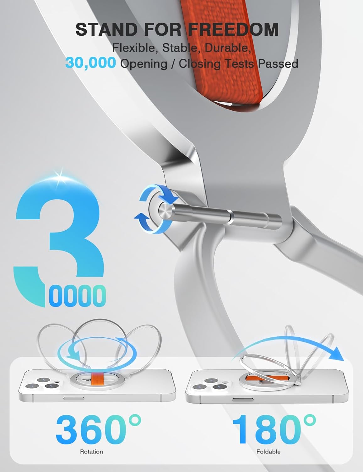 - 【Bigger Ring Stand, Durable still functional】This incredible stand is crafted from the finest aerospace-grade aluminum alloy and features reinforced hinges that have passed rigorous 30,000-opening-and-closing tests. Its 360-degree rotation and adjustable angle settings ensure optimal viewing for any phone. Its slim profile of just 3.6mm and compact foldable design make it convenient to carry in your pocket when not in use.