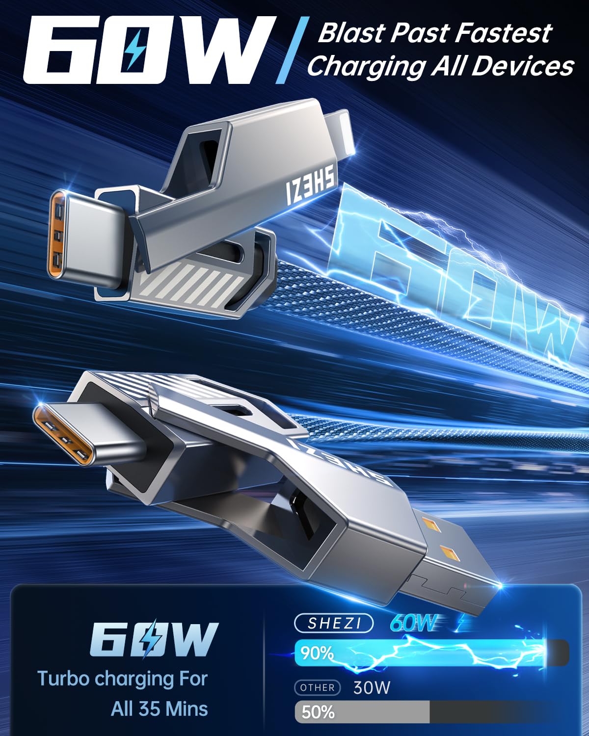 - 60W High-Speed Charging: Our multi-charging cable is equipped with 60W charging power, allowing you to get the power required for one day in 35 minutes. Note: To achieve 60w fast charging, please be equipped with a charging adapter of more than 60W