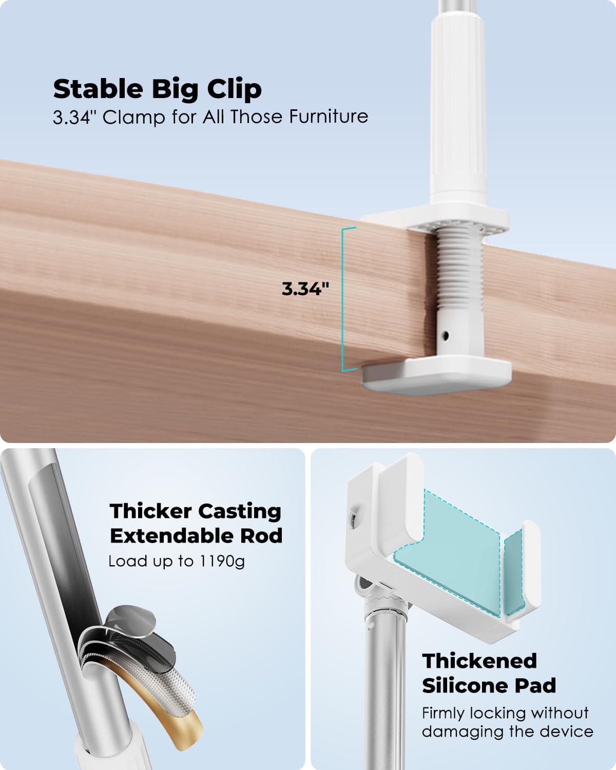- Stable & Durable with Reliable Desk Clamp: This Kindle mount, made of high-quality aluminum and magnesium alloy, provides long-lasting support. The extendable rod supports up to 1.1 pounds devices, suitable for most electronic devices. Non-slip silicone pads secure your device, while the C-clamp (0-3.34 inches) fits most desktops and surfaces like bed boards and tables. High-quality materials and craftsmanship ensure durability and versatility for work, study, and life.