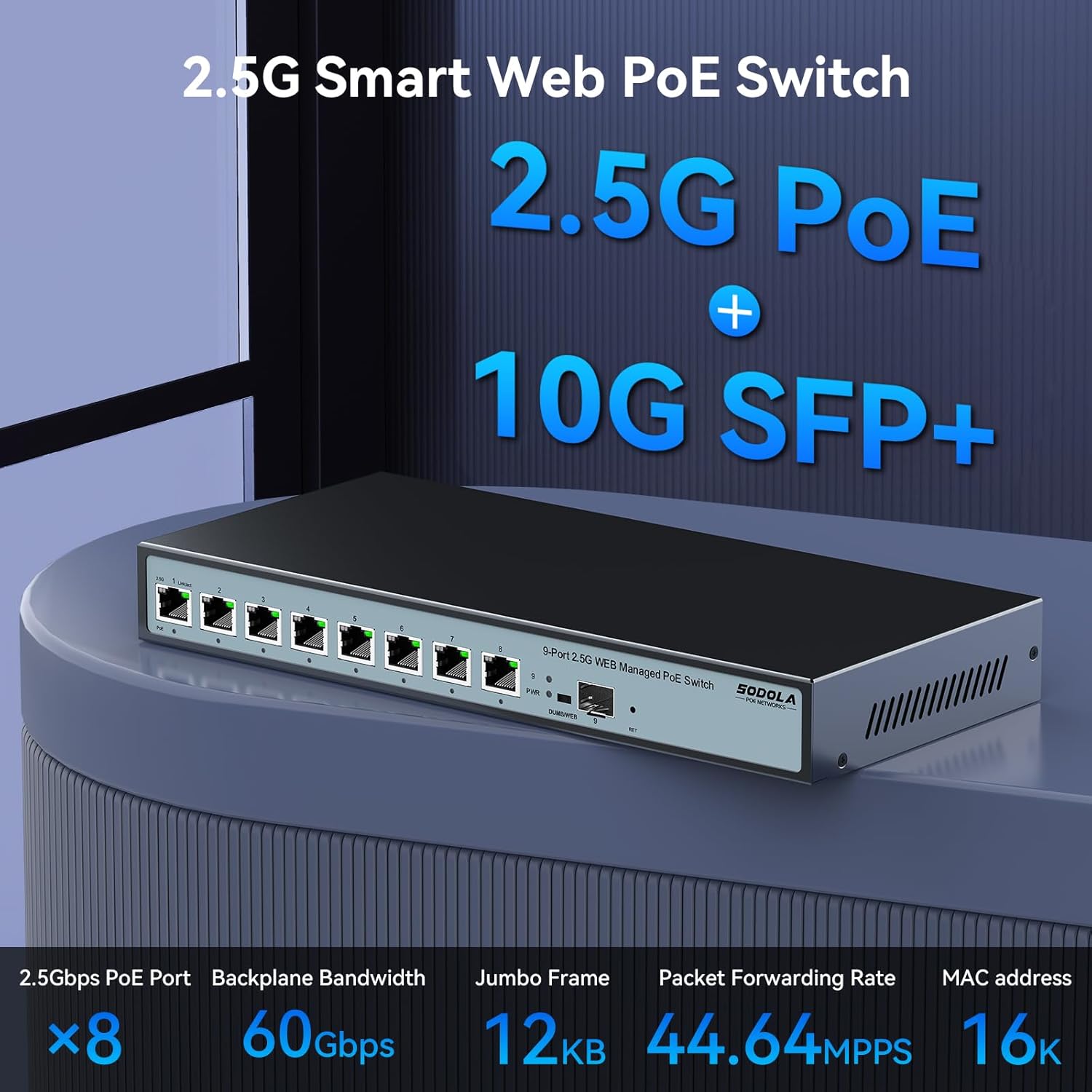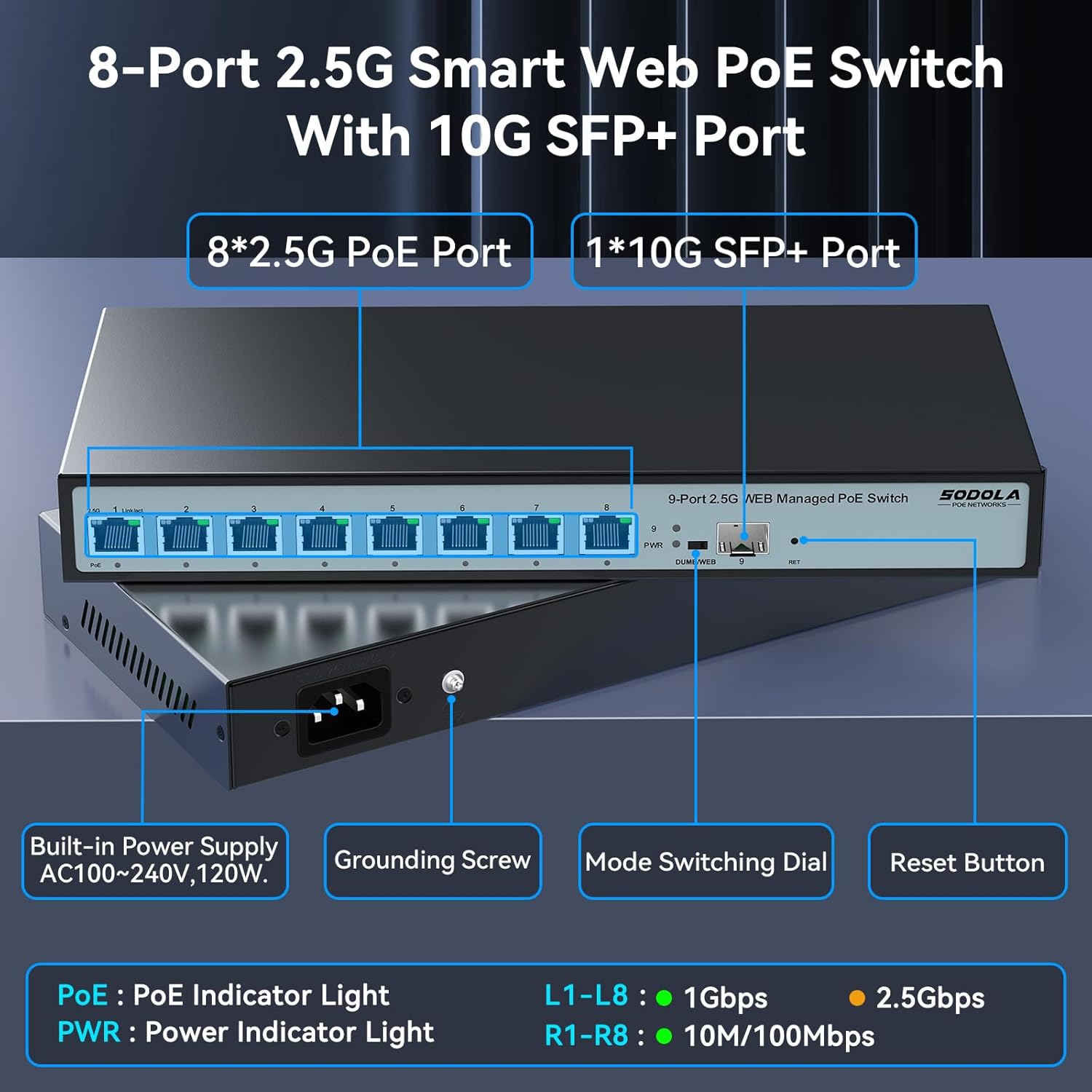SODOLA 8 Port 2.5G Web Managed PoE Switch 120W | 1X 10G SFP+ & 8 x 2.5GBase-T Ports, Max 90W Output, IEEE802.3af/at/bt, Desktop & Wall Mount 2.5GbE Network Switch