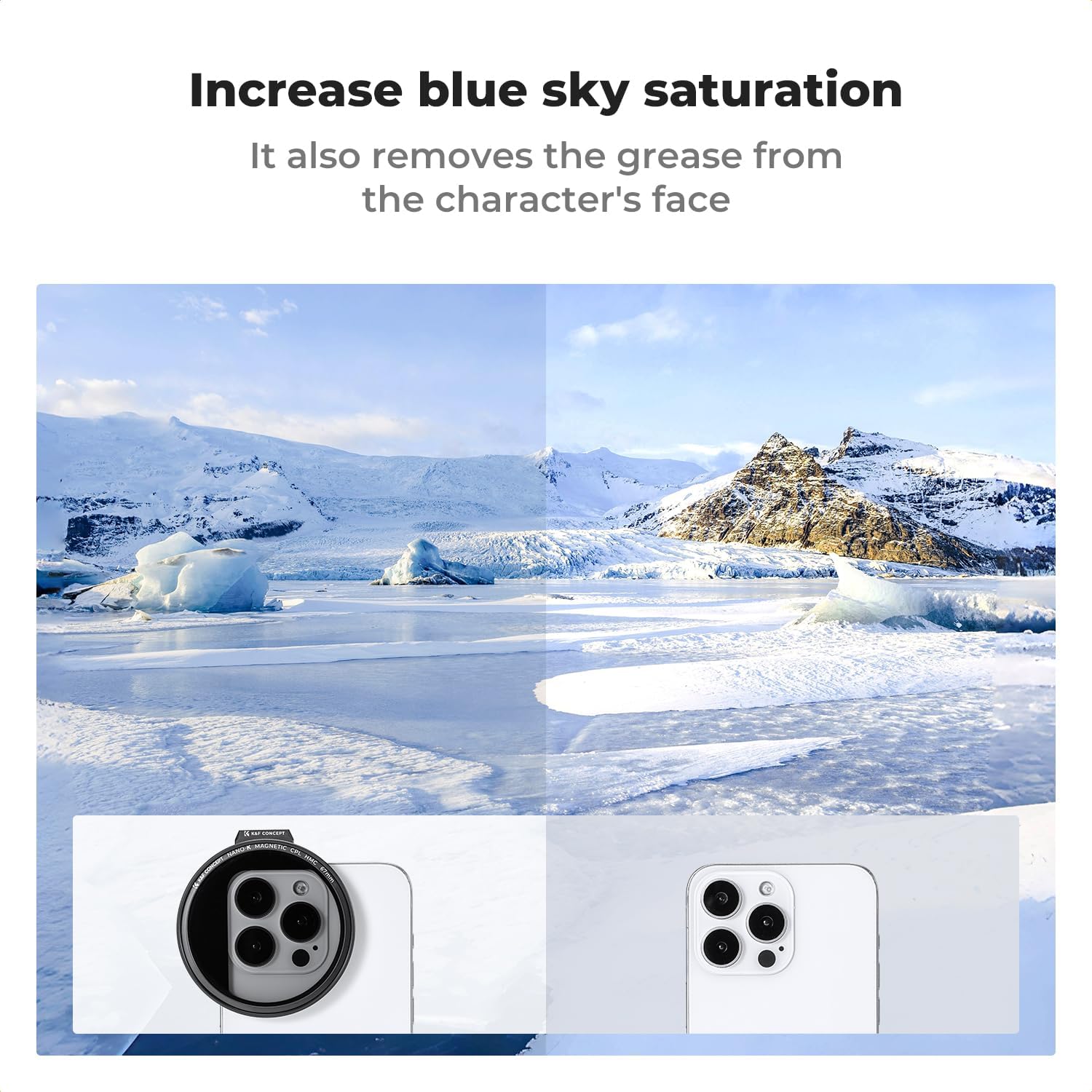 - ăK&F Concept 67mm Magnetic FilterăThe K&F Concept 67mm Magnetic CPL filter can enhance the color and contrast, and remove non-metallic reflections such as water, and glass to show the true color, especially used in white cloud and blue sky photography.