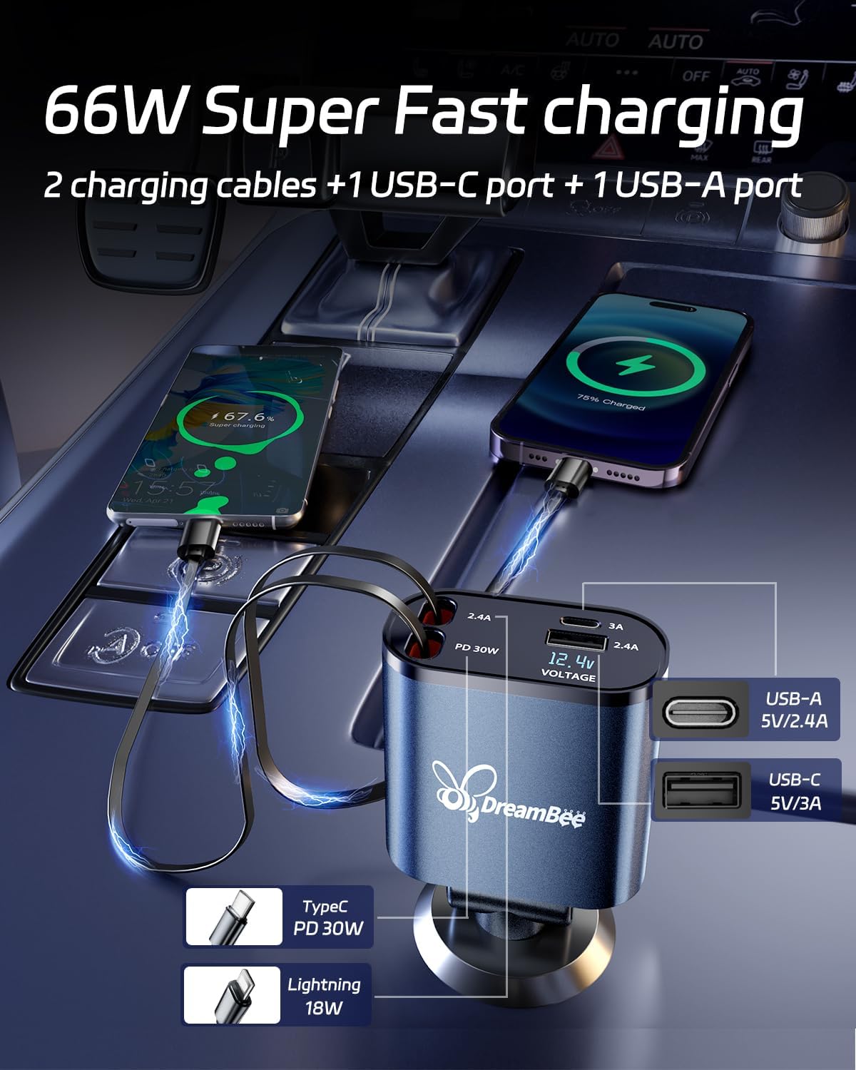 - 【Specific Parameters】DreamBee car cell phone charger can be used for 12V DC and 24V DC. Power rating: 66W.Type-C retractable cable output: PD30W max.IOS retractable cable output: 5V/2.4A.Type-C port output: 5V/3A.USB-A port output: 5V/2.4A: 5V/2.4A