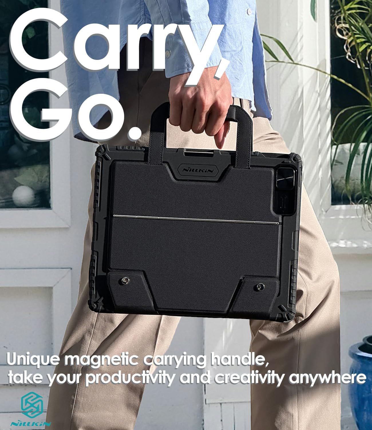 - 【Easy Setup, Carry Go】With Nillkin Carry Go case keyboard, your iPad becomes a mobile workstation. The unique magnetic carrying handle makes it easy to take your iPad everywhere. Easy to setup and ready to work, close the cover, carry the handle and take your iPad on the road with your productivity and creativity, perfect for business or outdoor use. **Case with keyboard compatible with iPad Air 13-inch M3 2025/M2 2024 (A3268,A3269,A2898,A2899), iPad Pro 12.9-inch 6th generation 2022 (A2436,A2437,A2764), iPad Pro-12.9 inch 5th generation 2021 (A2378,A2379,A2461), iPad Pro 12.9-inch 4th Generation 2020 (A2069,A2229,A2232), iPad Pro 12.9-inch 3rd generation 2018 (A1876,A1895,A2014).