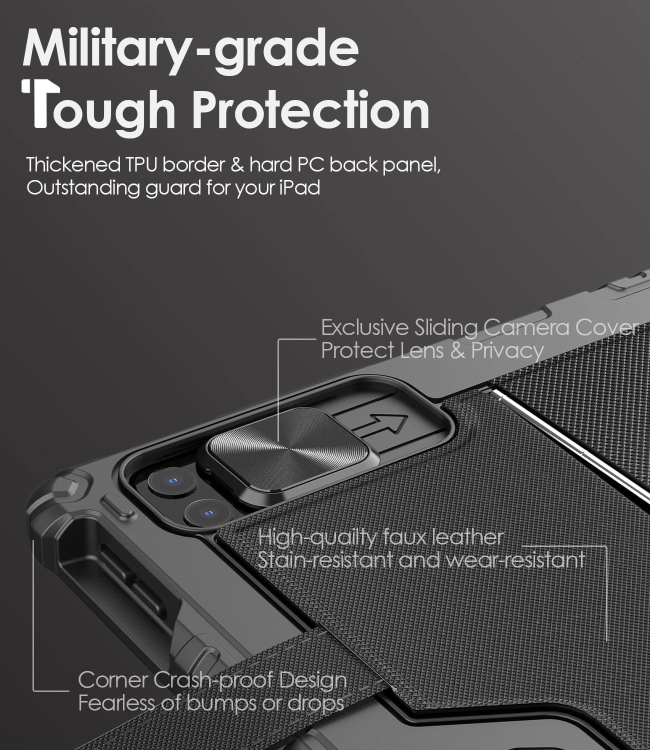 - 【Tough Protective Case】The heavy-duty thickened TPU frame and PC back, combined with a corner shockproof design, provide full-body military-grade rugged protection for your iPad, safeguarding it from bumps or drops. The surface covered with high quality faux leather, stain-resistant and wear-resistant. Unique sliding camera cover protects the lens while keeping your privacy.