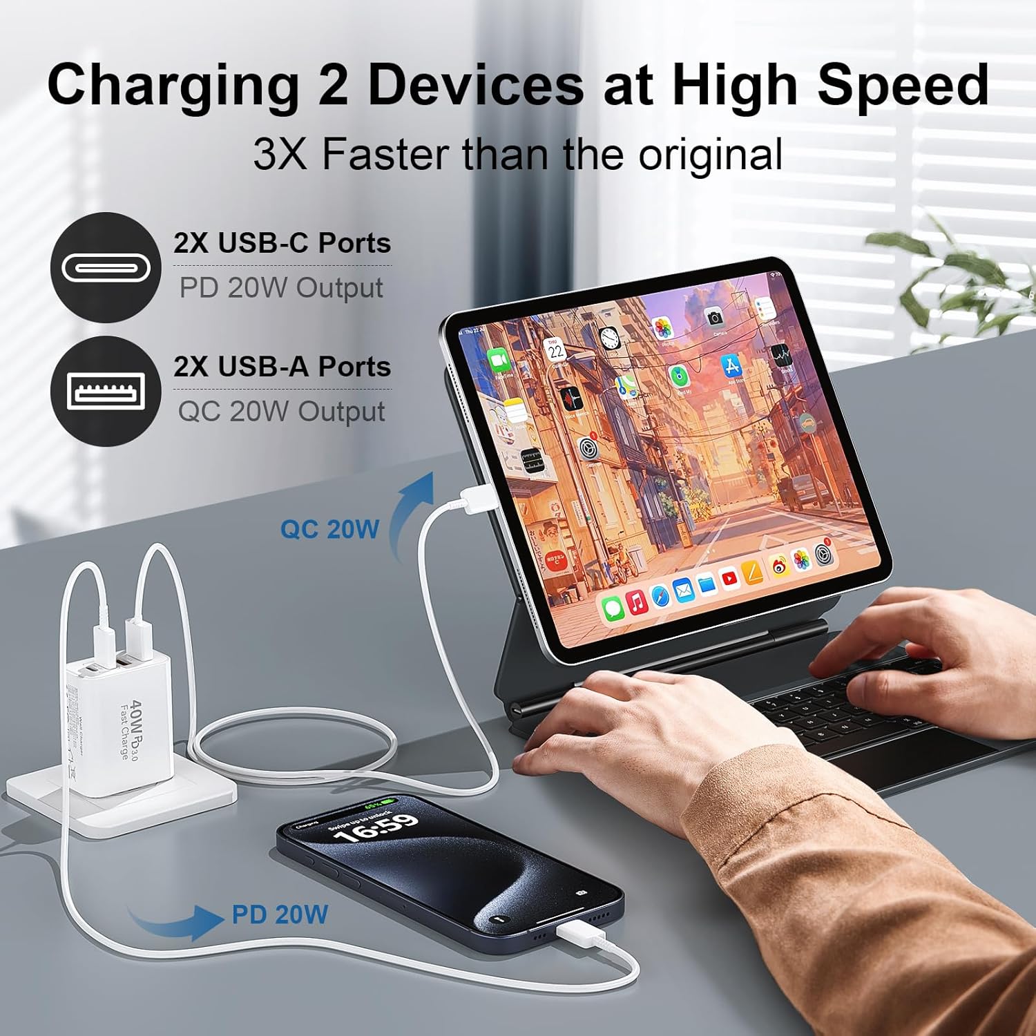 - 2-Pack 40W USB C Charger Fast Charging Blocks: Auorld 40W USB C Fast Charging Blocks support the Power Delivery and Quick Charge 3.0 fast charging functions with a total power of up to 40W. The USB-A port offers an output power of 3.1 A/5 V, while each USB-C port provides Max 20W output power, charge your Phone 16 15 Pro Max up to 50% in just 30mins