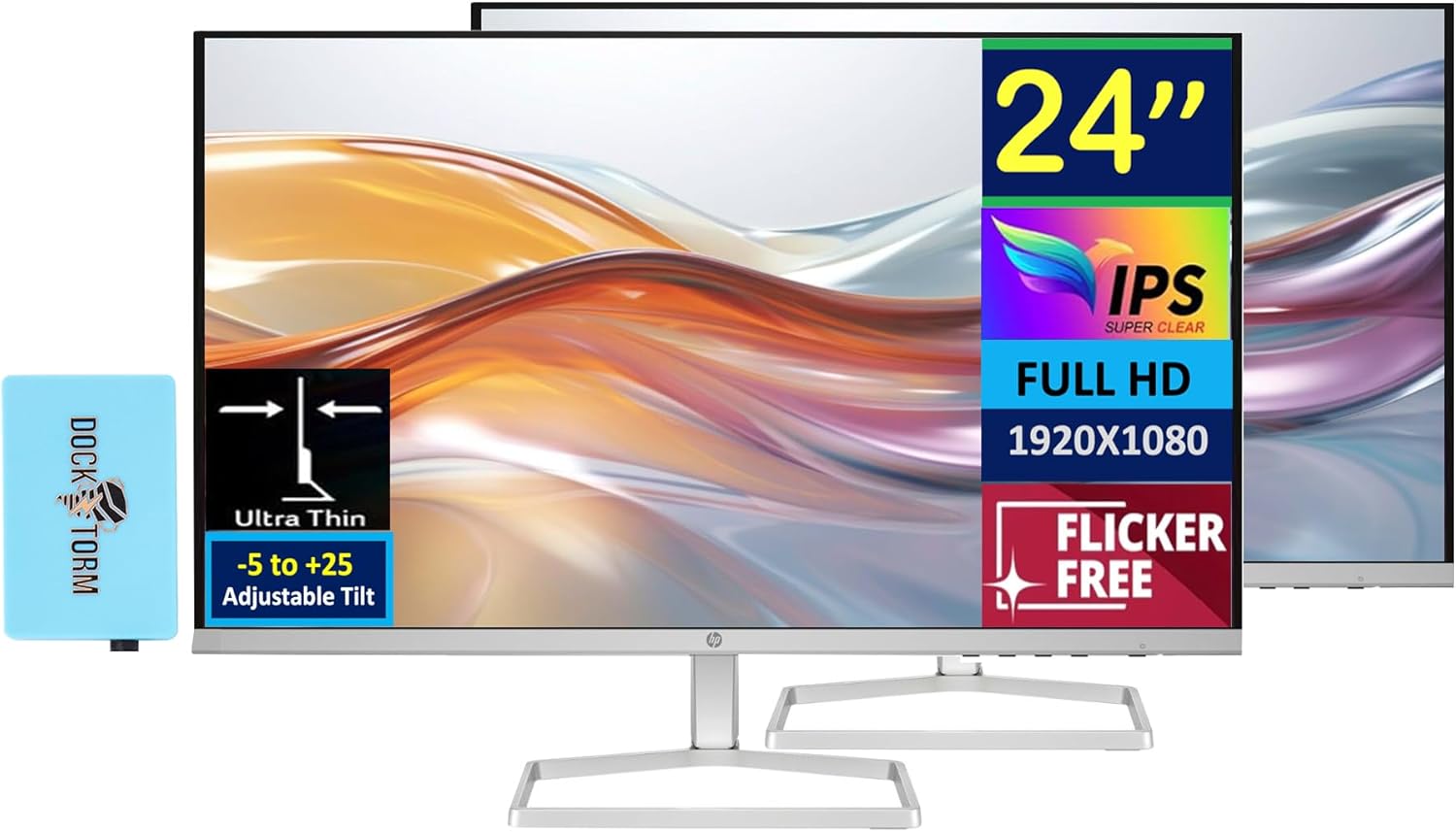 HP Series 5 524sw 24" 300 nits IPS FHD Monitor (Replaces M24FW) Adjustable Tilt, Flicker Free, Anti-glare, Ultra-thin, Low-Blue Light Filter, 1x HDMI, White/Silver w/DKZ Hub USB Port Expander (2 Pack)