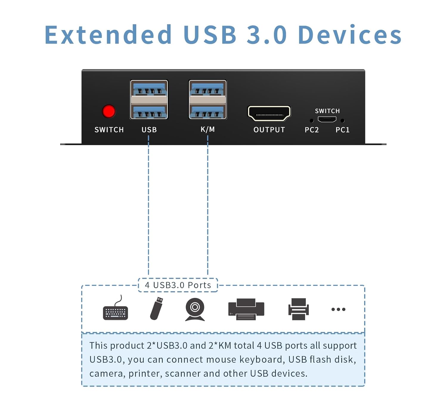 - ăHD 4K@60HZ and USB3.0 RateăKVM switch supports 4K@60HZ HD resolution, also supports 2K@60HZ, 1080P@120HZ and so on. It supports USB3.0 with a transfer rate of 5Gbps, mechanical keyboard, gaming mouse, printer, scanner, and so on.