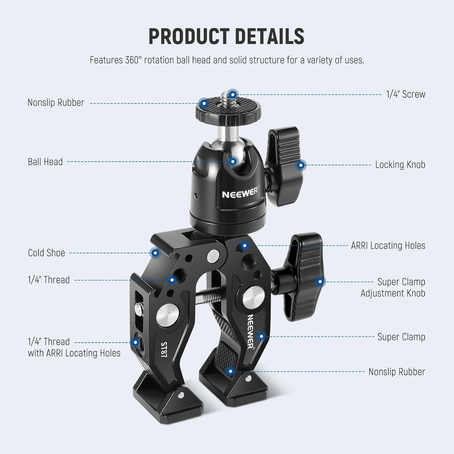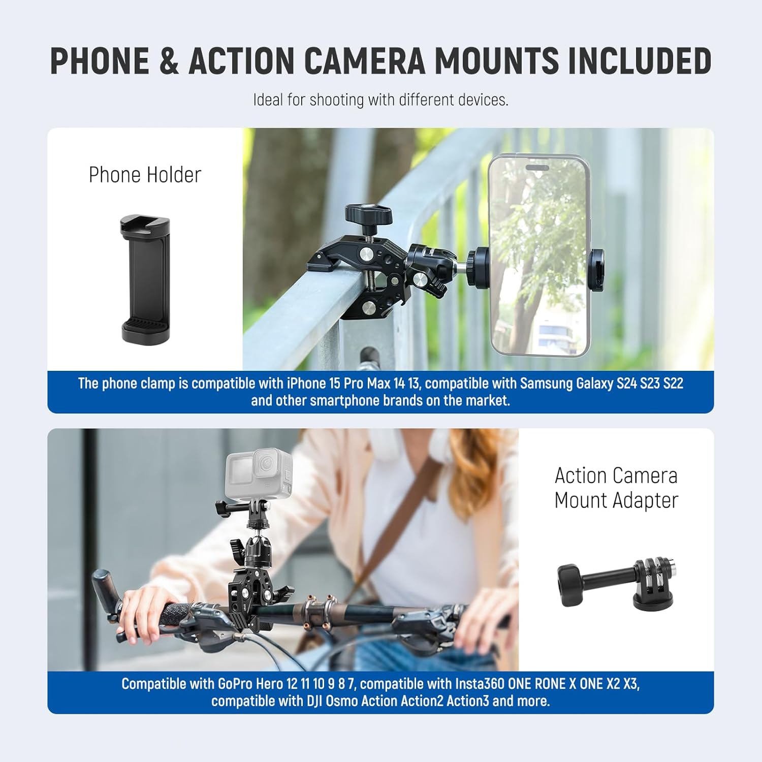 Neewer Super Clamp with Ballhead, Cold Shoe, Phone Holder and Action Camera Mount Adapter for Flat/Round Surface Compatible with GoPro DJI iPhone 15 Pro Max, ST87