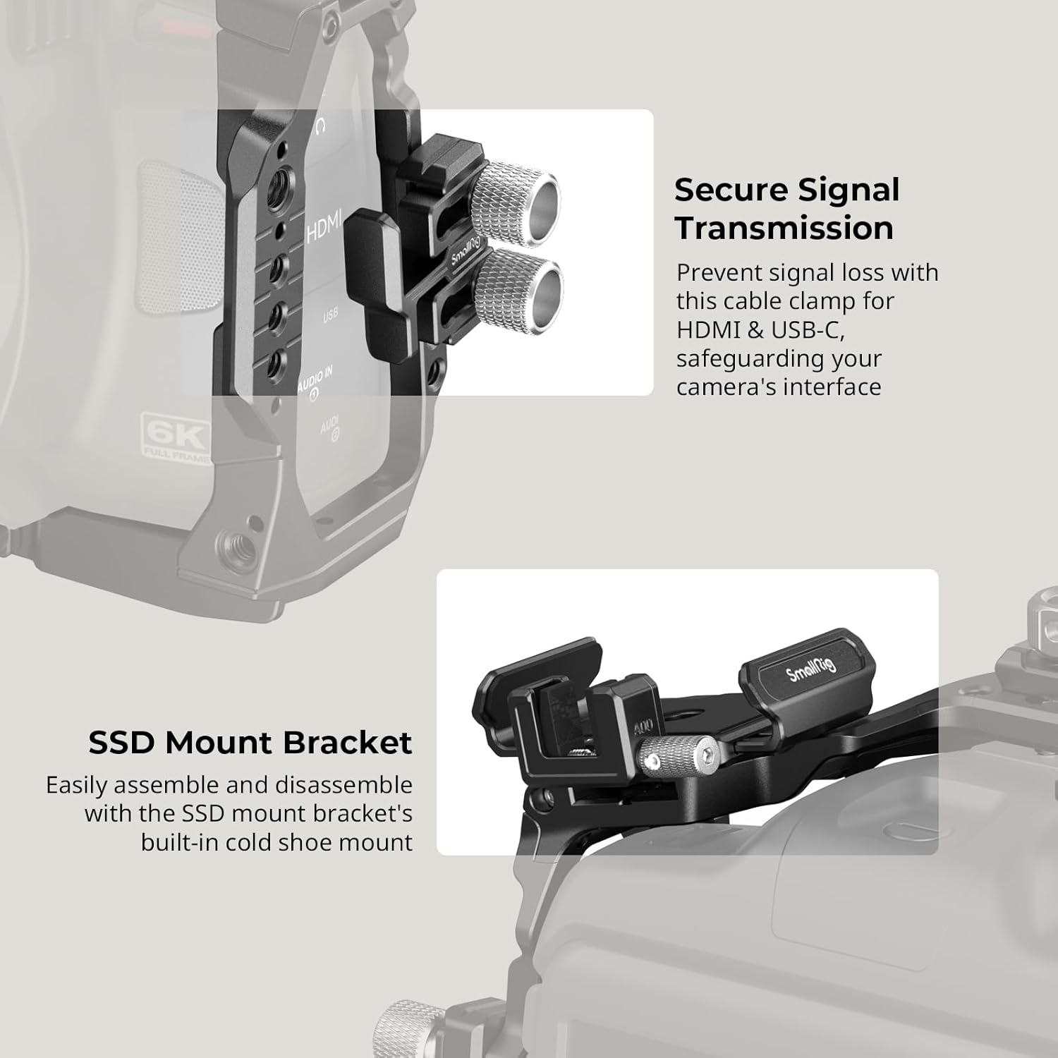 - Three-Point Locking System: Three-point locking system secures the camera via two 1/4"-20 screws at the base and a 1/4"-20 screw on the top, while integrated silicone pads prevent scratching. The cage provides unobstructed access to all camera interfaces, card slots, the flip screen, and the battery compartment.