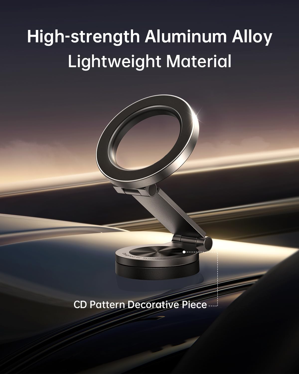 - 【360° Rotation &Two-Axis Foldable Design】With a 360° rotatable base and two-axis adjustable aluminum alloy arm, this design can be flexibly adjusted to create a variety of angles. You can fix the MagSafe car mount in any scene, such as car dashboard, windshield, Tesla screen, and desktop. The foldable design enables you to hide the car phone holder to create a neater use environment.