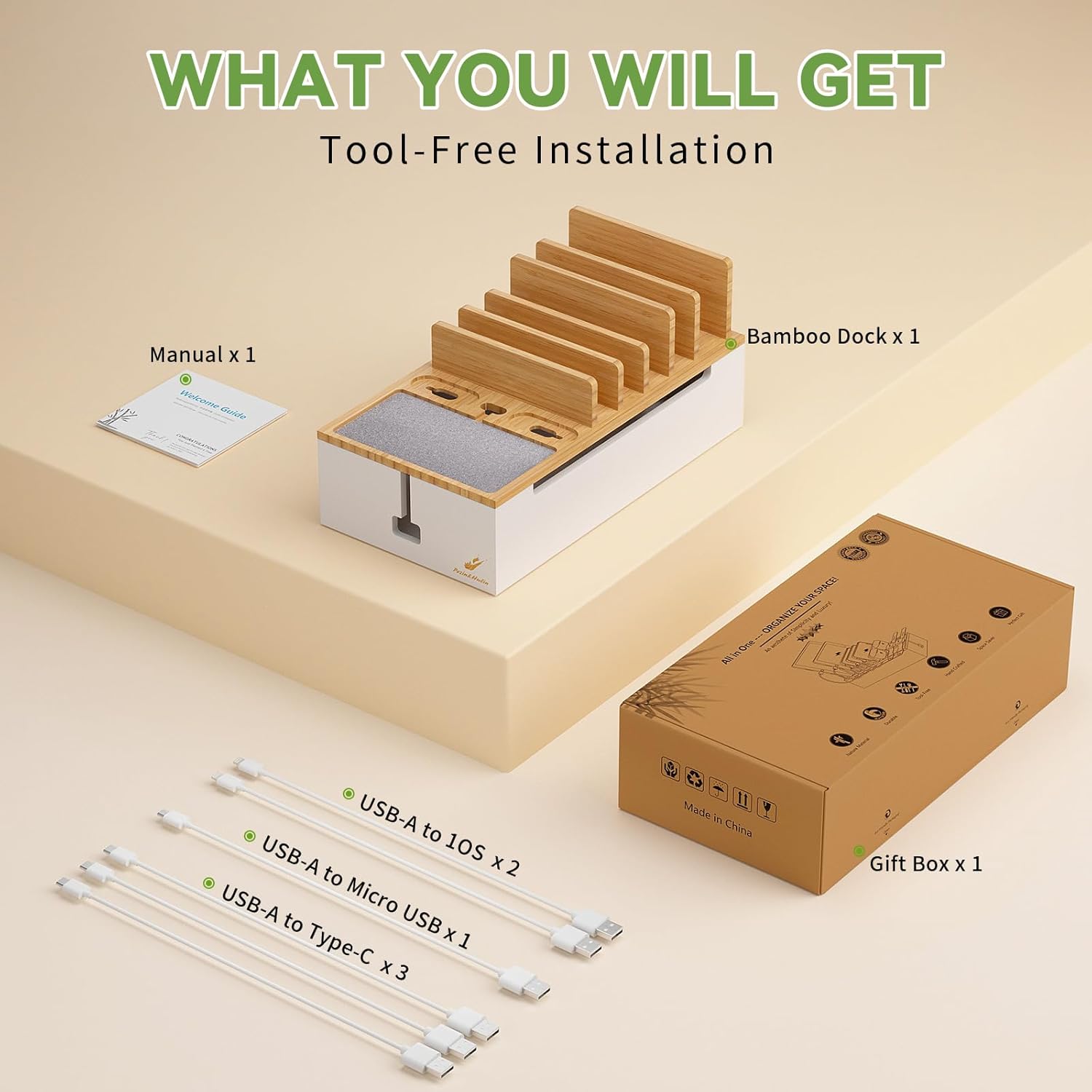 - What You Can Get: 1 x Pezin & Hulin Bamboo Charging Station, 6 x Short USB Cables (3pc Type-C, 2pc for lPhone & lPad, 1pc Android) for your daily use, 1 x user manual (PLEASE NOTE: The charger HUB power supply is not included in the package)