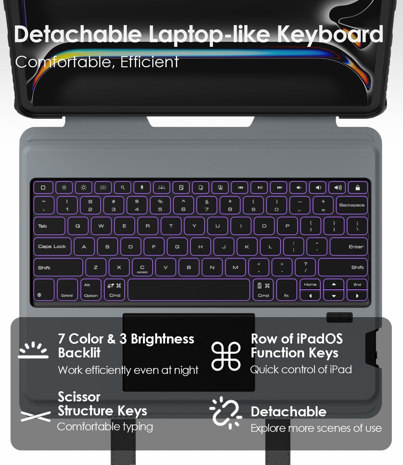 - 【Detachable Backlit Keyboard】Clear key feedback offers a laptop-like responsive and comfortable typing experience. A full row of function keys, support for iPadOS shortcuts for quick editing of documents, programming, photo editing or video editing, maximizing your productivity. The keyboard features 7 color options and 3 levels of backlit brightness, making it possible to work efficiently even in dark environments.