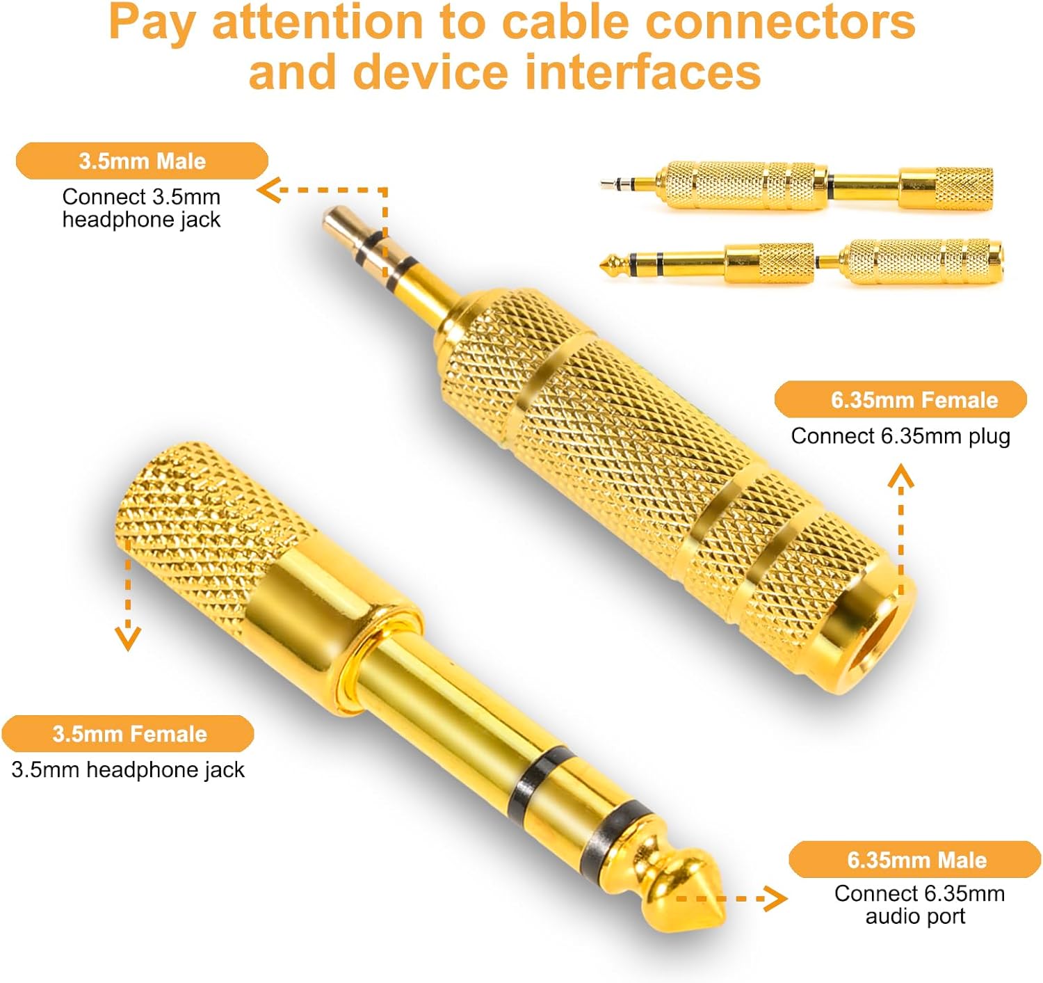 - MULTI-FUNCTIONAL COMBINATION: This product has 4 adapters, divided into 2 types, 2 of each type. Among them, the 6.35mm male to 3.5mm female plug adapter is suitable for accessing audio devices with 6.35mm plugs, such as amplifiers, electric guitars/pianos, stereo systems and so on. And the 3.5mm male to 6.35mm female plug adapter is suitable for connecting 3.5mm (1/8-inch) stereo equipment to headphones with standard 6.35mm (1/4-inch) plug.