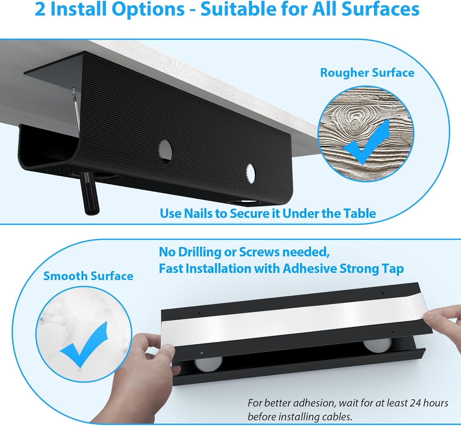 - Simple and Easy Installation: Each ZhiYo Cord Tray comes with 1 roll of adhesive tape, and 9 screws and anchors, suitable for all surfaces (smooth or rough). With 4 pre-drilled mounting holes, nail installation is also straightforward. The package includes 2 desk cable trays, 4 cable clips, and 5 reusable cable ties for added value