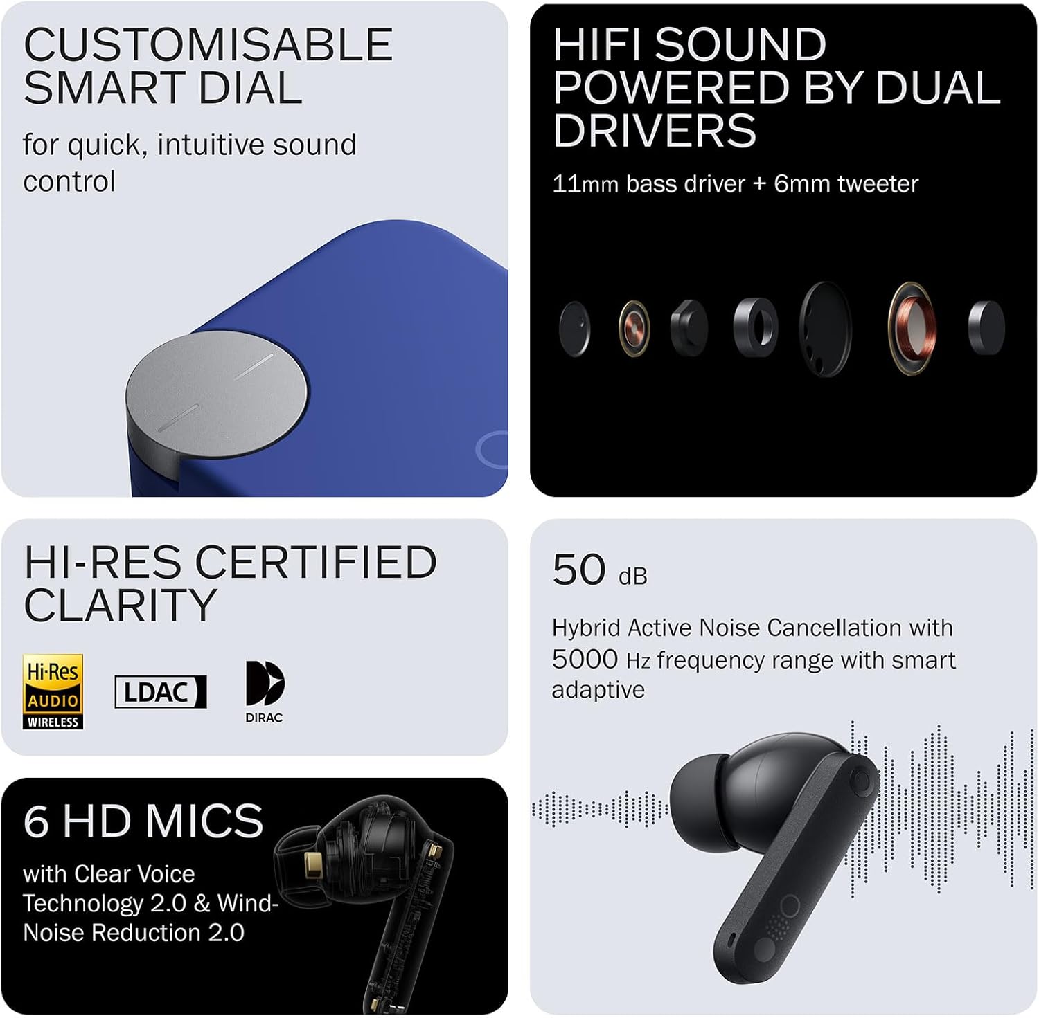 - YOUR ON-THE-GO SOUND FILTER: Enjoy pristine audio clarity and uninterrupted focus with advanced Hybrid Active Noise Cancellation of up to 50 dB and an expansive frequency range of up to 5000 Hz. The ANC technology efficiently silences a wide spectrum of ambient sounds β from everyday conversations to rumbling subway trains