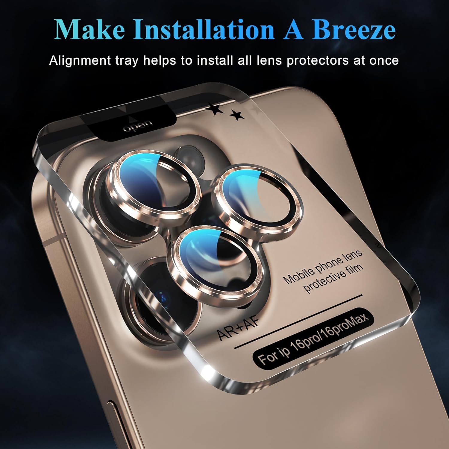 - One-step Installation: The iPhone 16 Pro camera lens protector is embedded in an acrylic positioning frame, just use our cleaning accessories to clean the lens, tear off the back protective film, align the camera lens and remove the positioning tray, the installation is done. All 3 individual camera lens covers are installed successfully at the same time, which is a very simple and considerate installation design. No bubbles and the lens cover will stick tightly for a perfect fit.