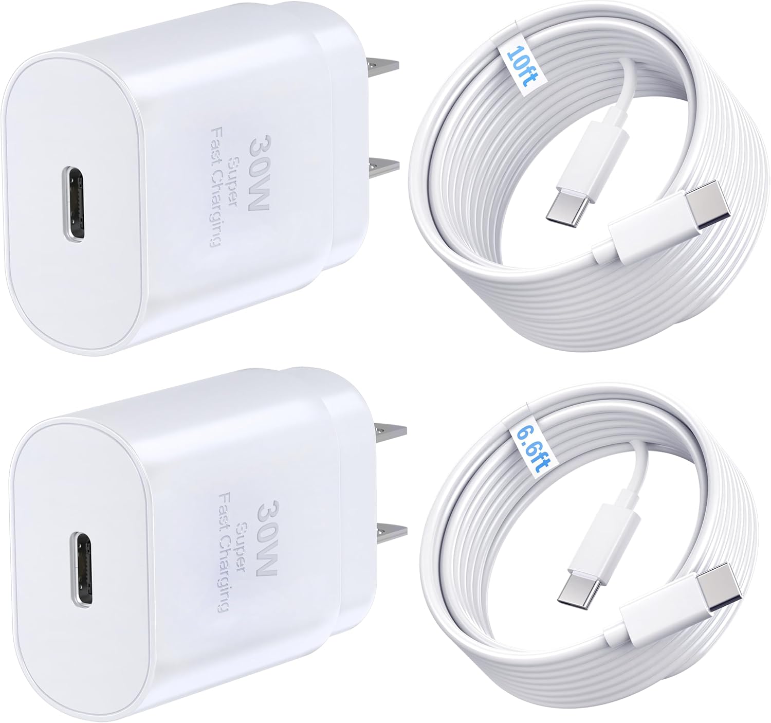 - Included Components : 2 x 30W Charging Block, 1 x 6.6ft Type C to C Charging Cord, 1 x 10ft Type C to C Charging Cord