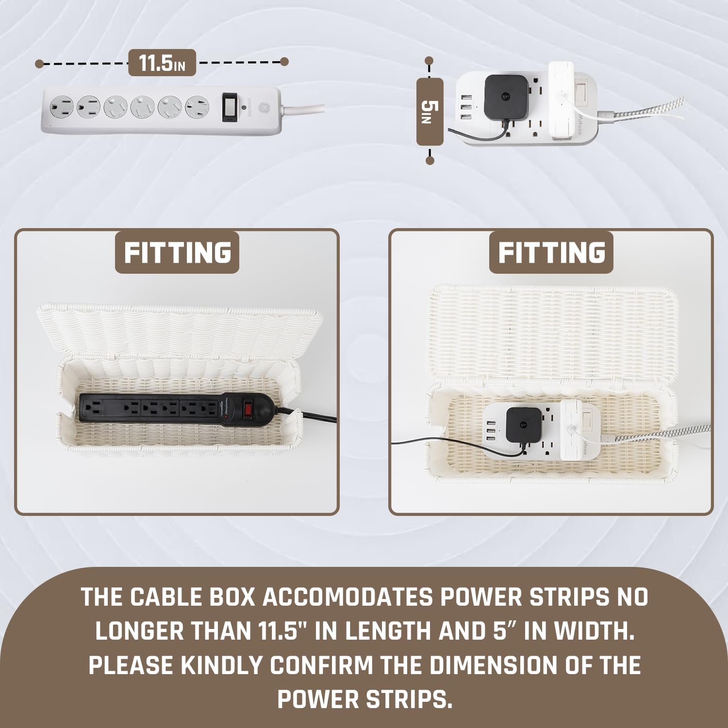 Cable Management Box, Handmade Rattan Cable Organizer, 2 Open Slots Cords Hider Box, Under Desk Cord Organizer for Computer Router USB Hub & Power Strip, Patent Pending, 13" x 5.1" x 5.1", White