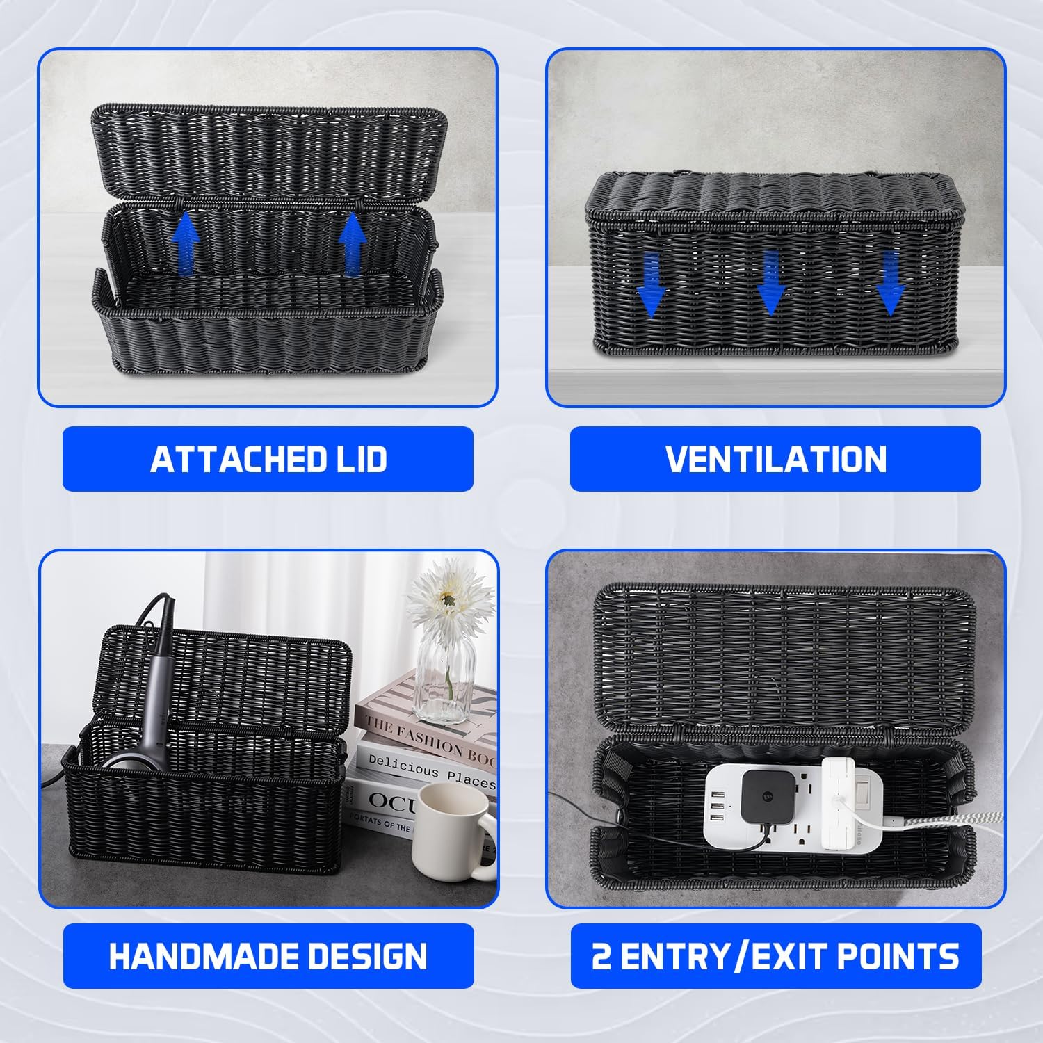 Cable Management Box, Handmade Rattan Cable Organizer, 2 Open Slots Cords Hider Box, Under Desk Cord Organizer for Computer Router USB Hub & Power Strip, Patent Pending, 13" x 5.1" x 5.1", Black