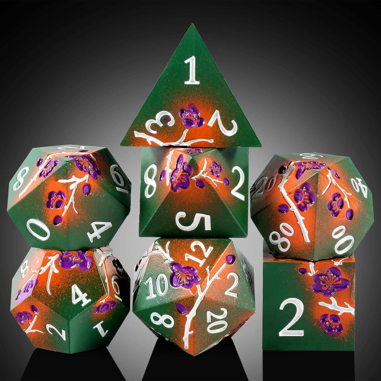 DNDND Metal Dice, 7 PCS Metallic Flowers D&D Dice with Gorgeous Gift Case for DND Dungeons and Dragon Tabletop Game (Army Green and Orange)
