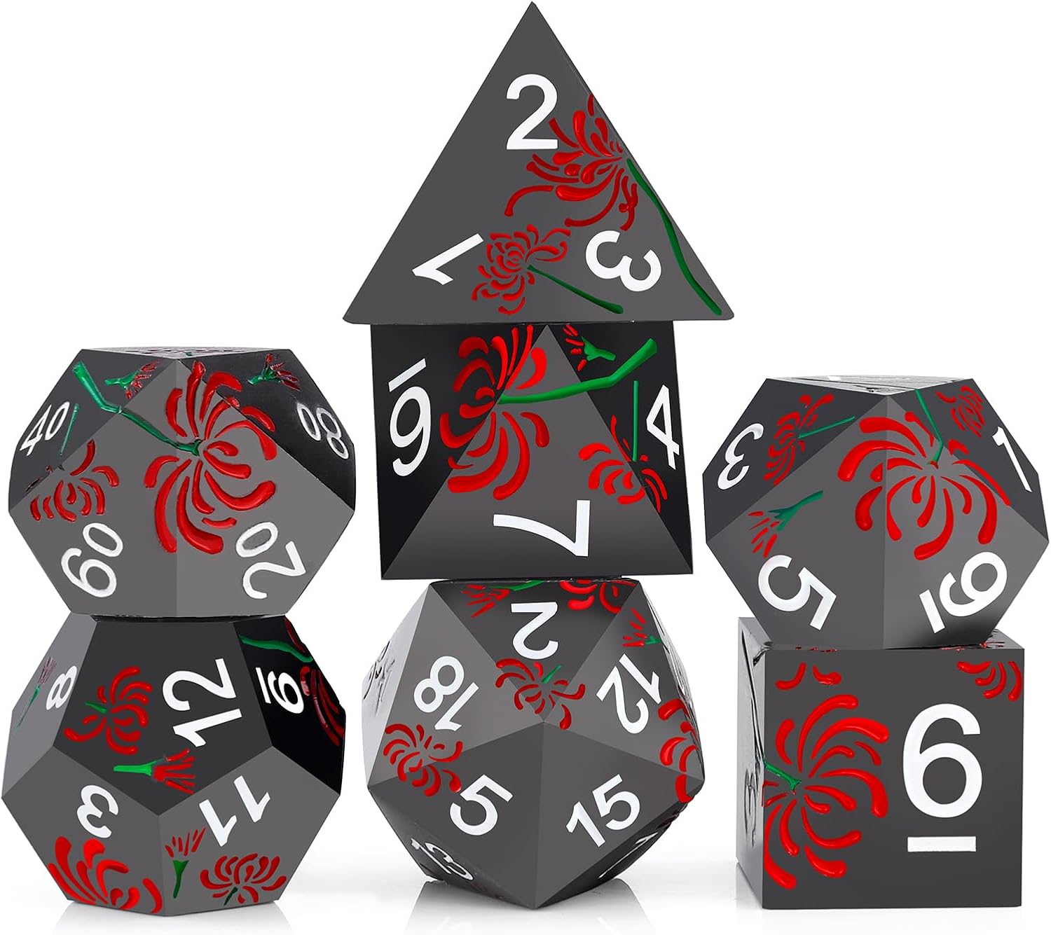 PJOY Metal Dice Set D&D Flower Dice Set DND Polyhedral Dice for RPG Role Playing Games Compatible with Dungeons and Dragons TTRPG Black Red White DND Dice