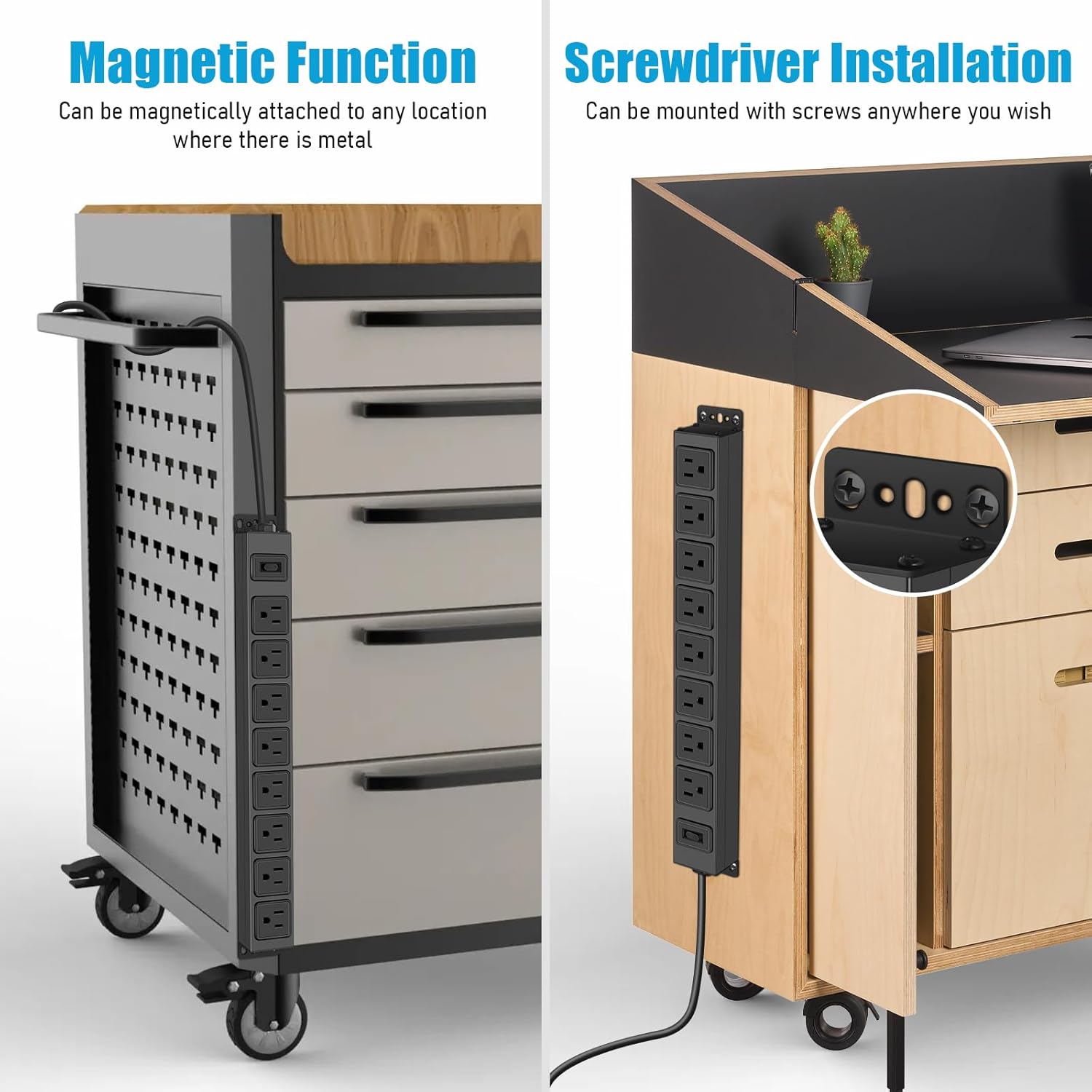 HHSOET Magnetic Mount Power Strip, 8 Outlet Mountable Socket, Metal Heavy Duty Surge Protector, Gaming Table Outlet, Easy to Fix Without Drilling or Taping, 10FT Extension Cord.(Black)