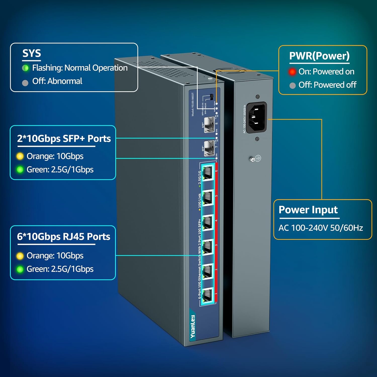 - 【8 Port 10Gbps Ethernet Switch】The product features 6x 10Gbps RJ45 Ethernet ports and 2x 10G SFP+ Ports for high-bandwidth connectivity. Each port supports auto-adaptive 10G/5G/2.5G/1G/100Mbps, allowing users to unlock the highest performance with 10G/multi-gig bandwidth.