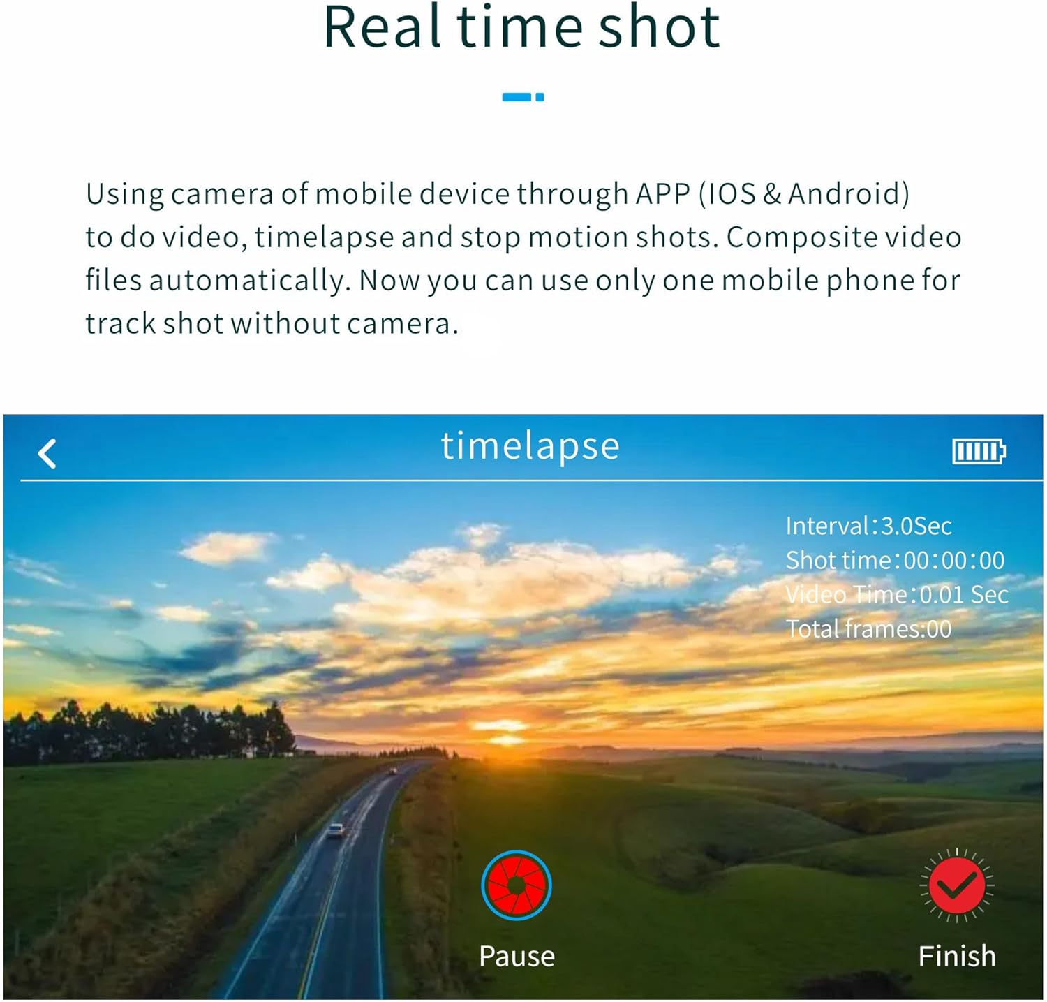 - Real time shot: Using camera of mobile device through APP to do video, time lapse and stop motion shots. Then the APP can composite video files automatically. Now you can use only one mobile device for slider shot without the second camera device.