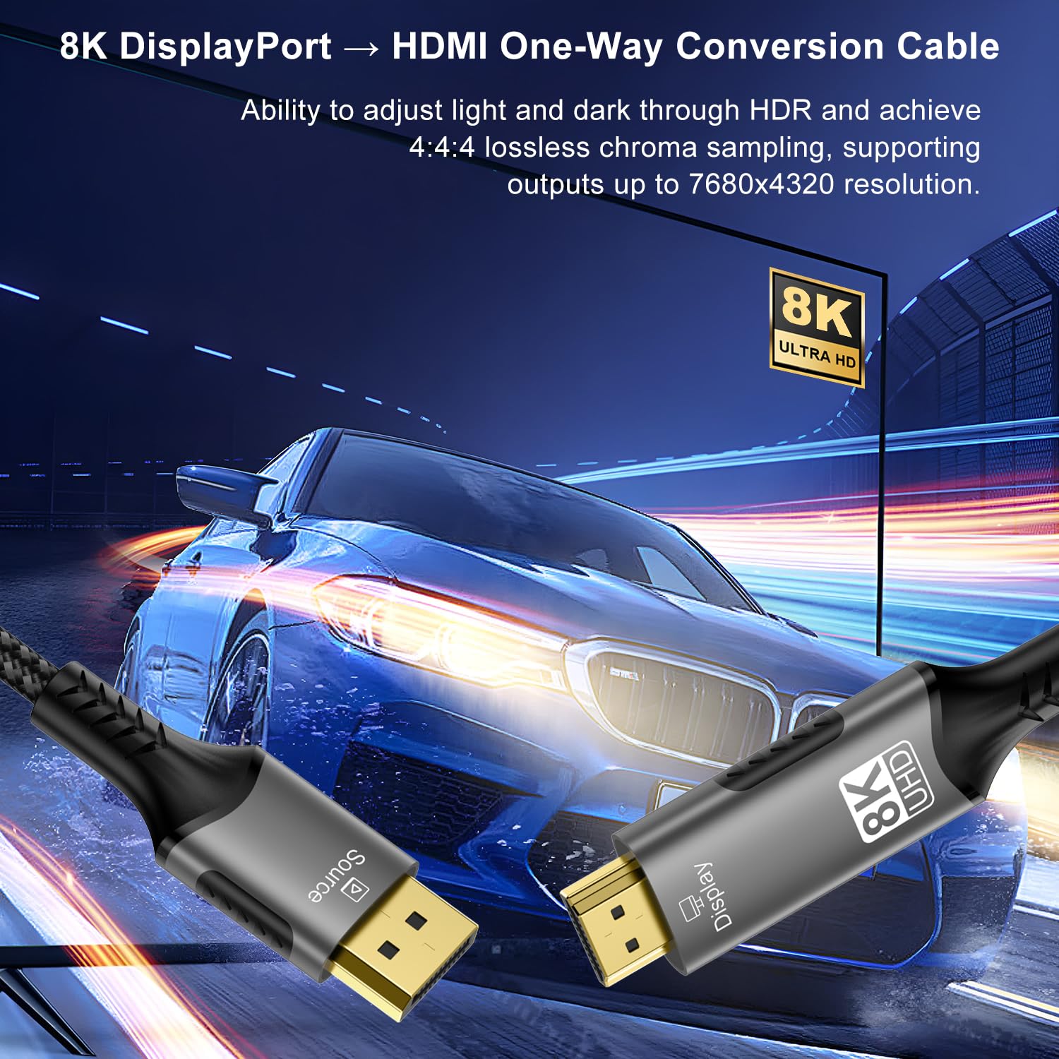 FDBRO 8K DisplayPort to HDMI Cable Active 8K@60Hz 4K@120Hz 32.4Gbps, Uni-Directional, DP 1.4 to HDMI 2.1 Cord Support HDR/HDCP 2.2/DSC 1.2 for Gaming Monitor, TV, PC (Gray & Black, 1M (3.3FT))