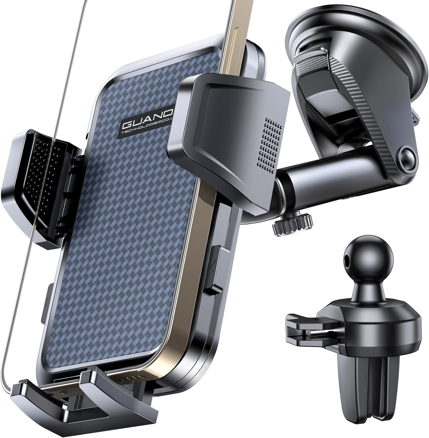 - Ergonomic Design: Equipped with the latest powerful suction cup, the car holder remains stable during adjustments. The Guanda car dash phone holder is designed to create a perfect driving experience for every driver. Its unique double button design enables one-handed operation. The improved and extended mechanical arm can be adjusted up to 270°. With the 360° rotatable ball head, you can easily switch between vertical and horizontal modes, allowing you to operate your phone comfortably and easily while driving