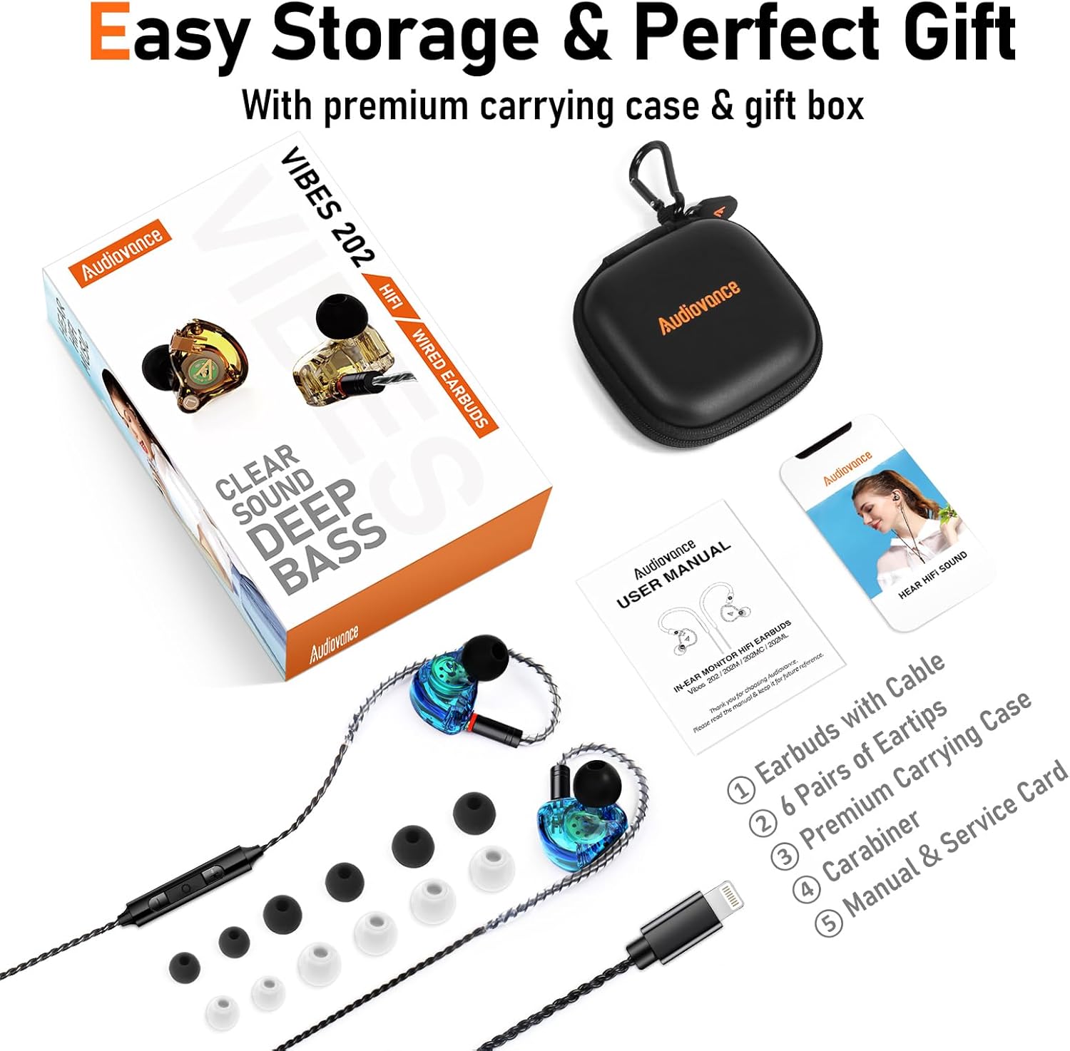 - FOR MUSICIANS & AUDIOPHILES – Vibes 202ML wired earbuds with a Lightning connector and microphone deliver high-fidelity sound for musicians—singers, drummers, or guitarists—and audiophiles seeking natural, detailed HiFi stereo sound. Experience powerful bass, rich mids, and crisp highs, plus spatial depth and crystal-clear calls, immersing you in studio-grade audio.