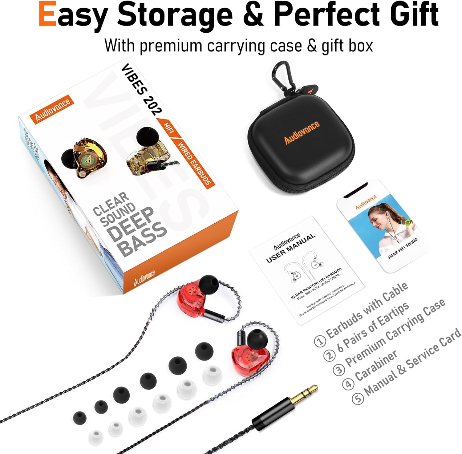 - What's in the Box: Vibes 202 red HiFi wired earbuds with silver-plated cable, 6 pairs of eartips, carrying case, carabiner & user manual.