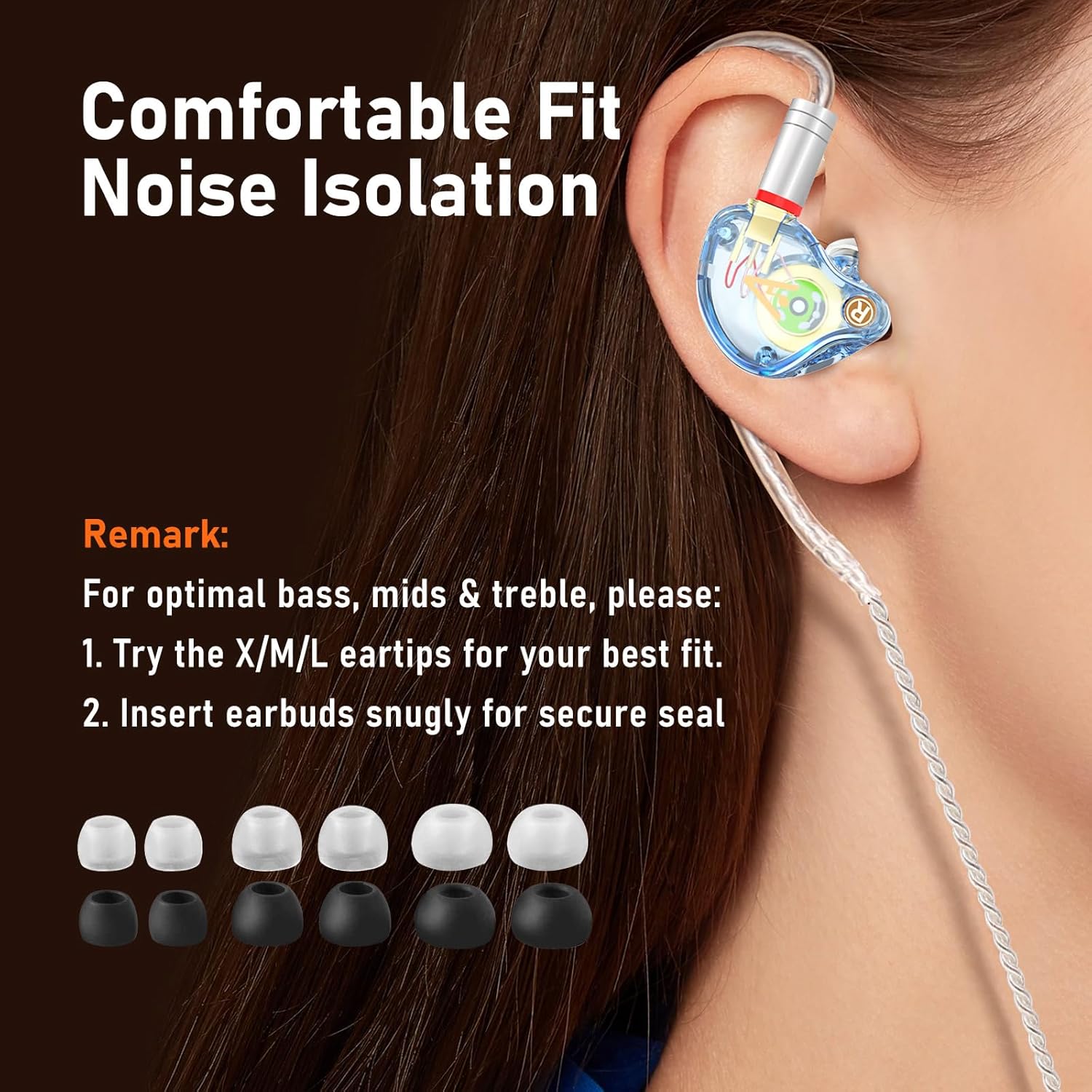- COMFORTABLE FIT & NOISE ISOLATION - Ergonomically designed to fit the ear canal, Vibes 202ML IEM headphones feature preformed over-ear earhooks for a secure fit and keep cables out of the way. With 6 pairs of soft, breathable eartips (in 2 colors and 3 sizes), they ensure optimal comfort and stability while effectively blocking ambient noise for immersive listening.