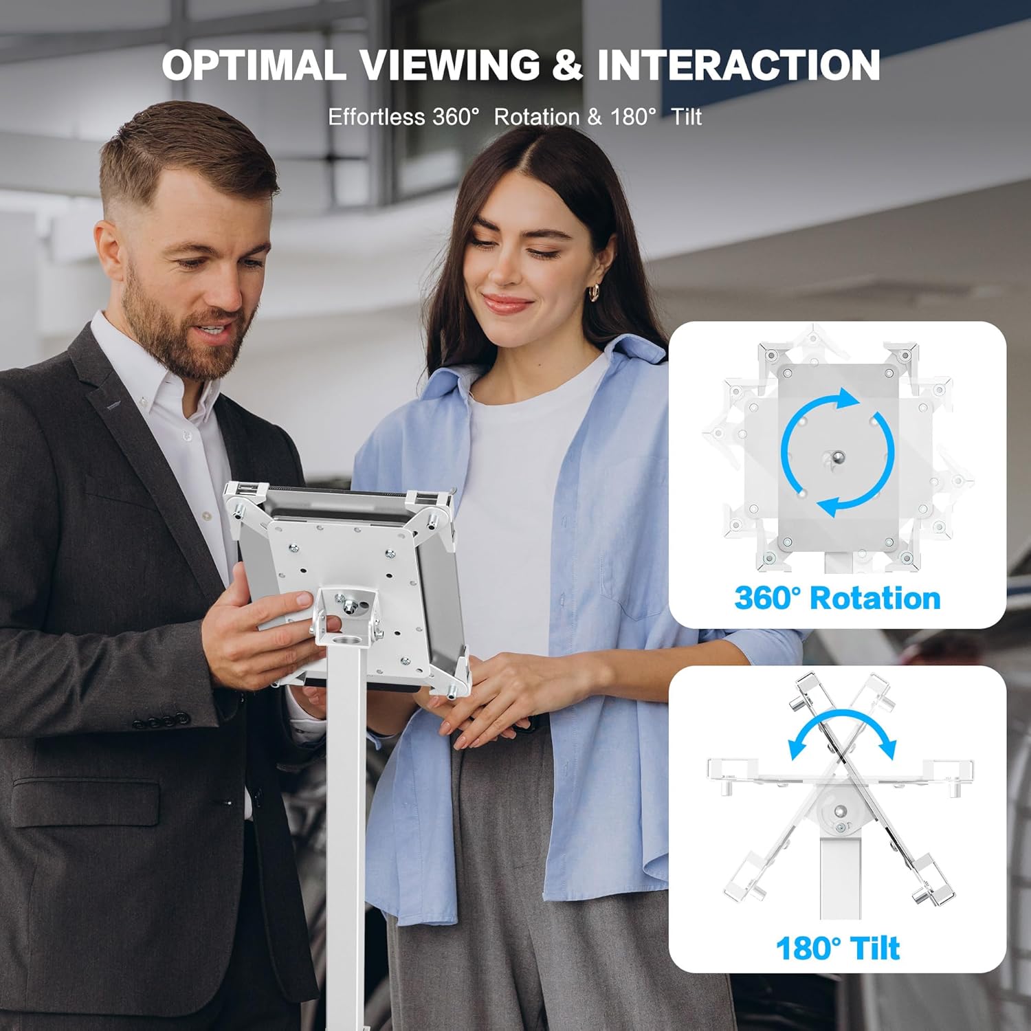 - 360° ROTATION & EASY INTERACTION: Enjoy full 360° rotation and tilt from -90° to 90° for the best viewing and interaction angles. Whether for presentations, kiosk displays, or self-service stations, this tablet stand floor ensures a secure and stable setup, complemented by an iPad POS stand for seamless operations.
