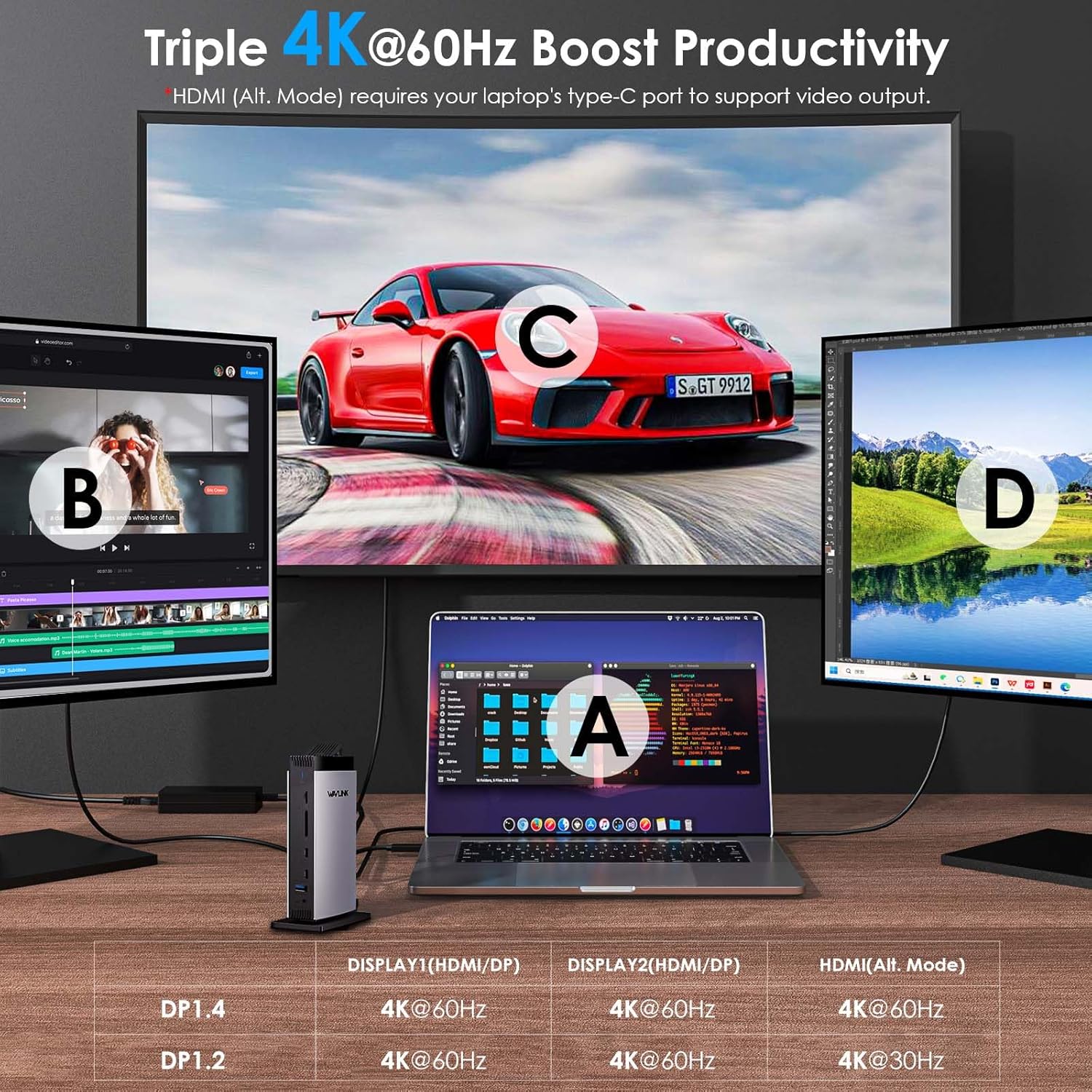 - 【Break the limit for M1/M2/M3】Unlock the full potential of your MacBook M1/M2/M3 or Windows laptop with the WAVLINK Displaylink Triple Display Docking Station. This USB C docking station allows you to effortlessly extend up to triple monitors with stunning 4K@60Hz resolution. Whether you need a triple 4K display setup or a mix of HDMI and DP connections, this docking station 3 monitors solution delivers exceptional visual clarity and productivity