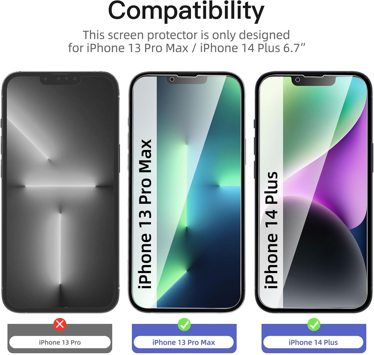 - Set of 3 Anti-Spy Tempered Glasses for iPhone 13 Pro Max, iPhone 14 Plus (6.7"), 9H hardness, resistance to scratches.
