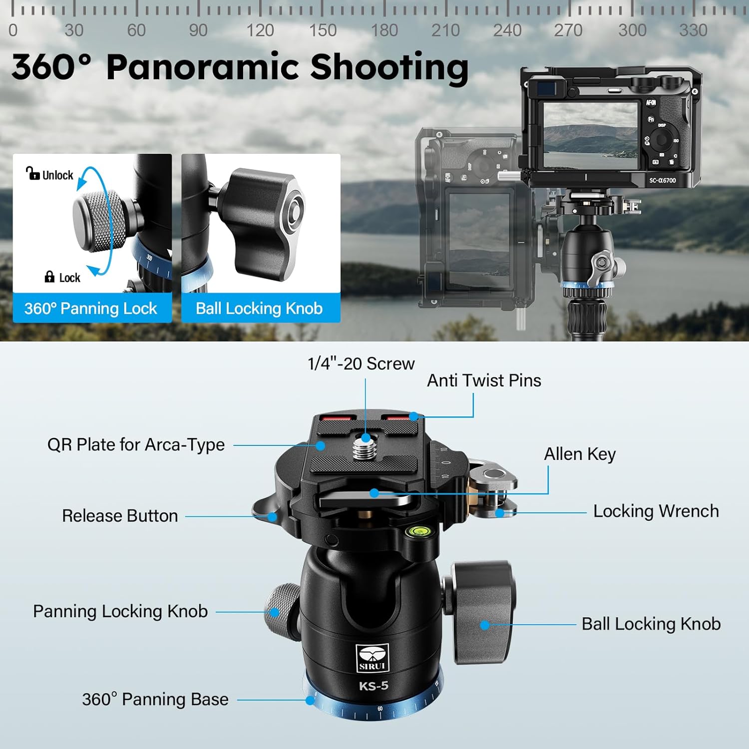 - 360°Panoramic Ball Head - The specially design ball-head can swivel 360° and tilt 90° smoothly with two independent control knobs, you can take photos at any angle in horizontal and vertical directions, making it easy to take panoramic photos or video shooting. The 360° horizontal scale at head bottom also improves positioning accuracy for precise shots. QR plate is equipped with standard 1/4" screw, compatible with most mirrorless cameras.