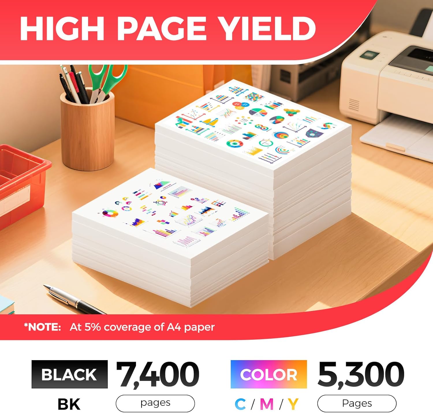 - High-Yield: up to 7,400 pages per T12 Black and 5,300 pages per T12 Color (Total 23,300 pages, 5% coverage).