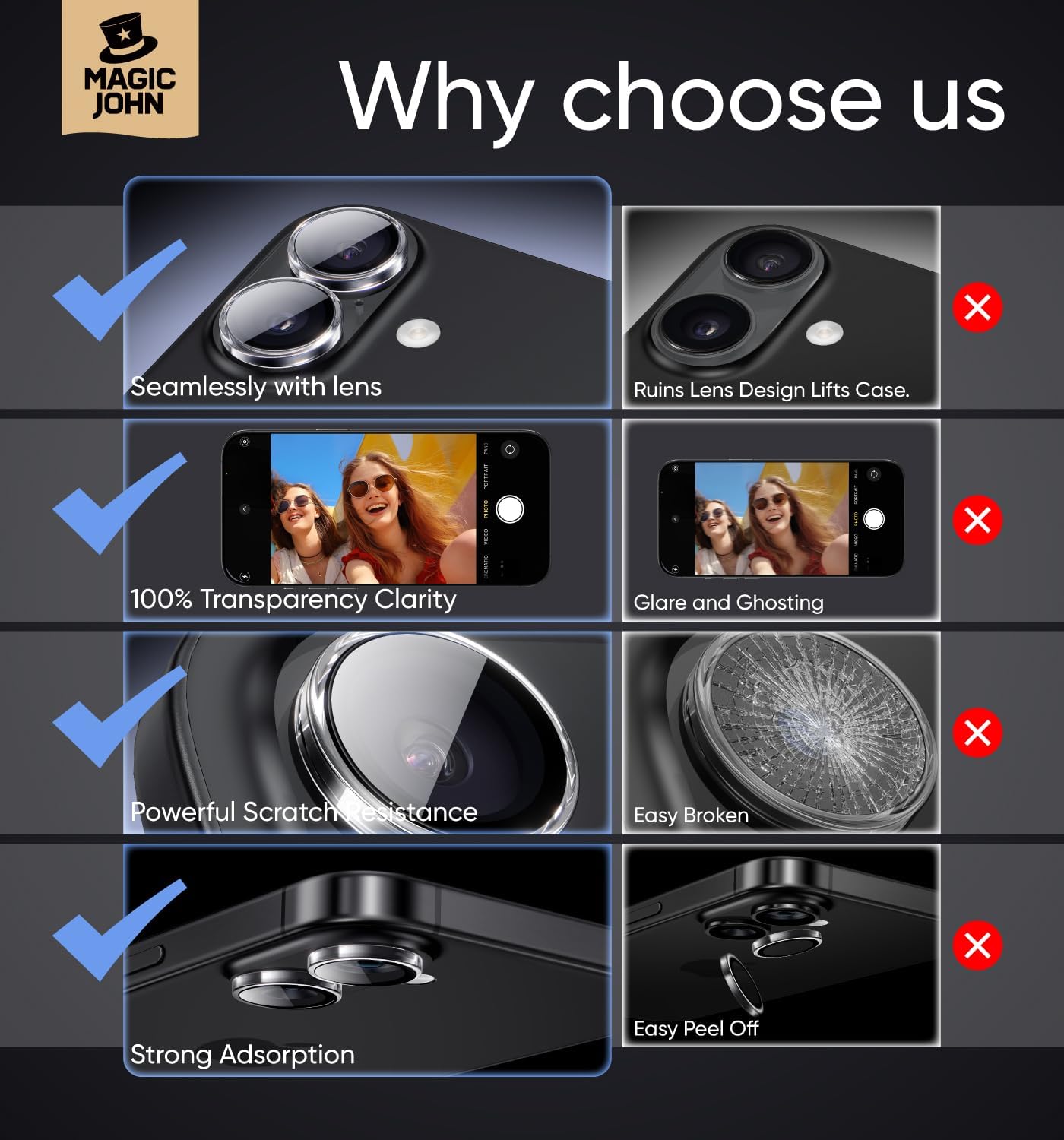 - [High-reduction Photography] MAGIC JOHN camera lens protector with upgraded sapphire material, 99.99% optical-grade light transmittance, AR anti-reflection technology which produces the same shooting results as the original iPhone 16/16plus camera.