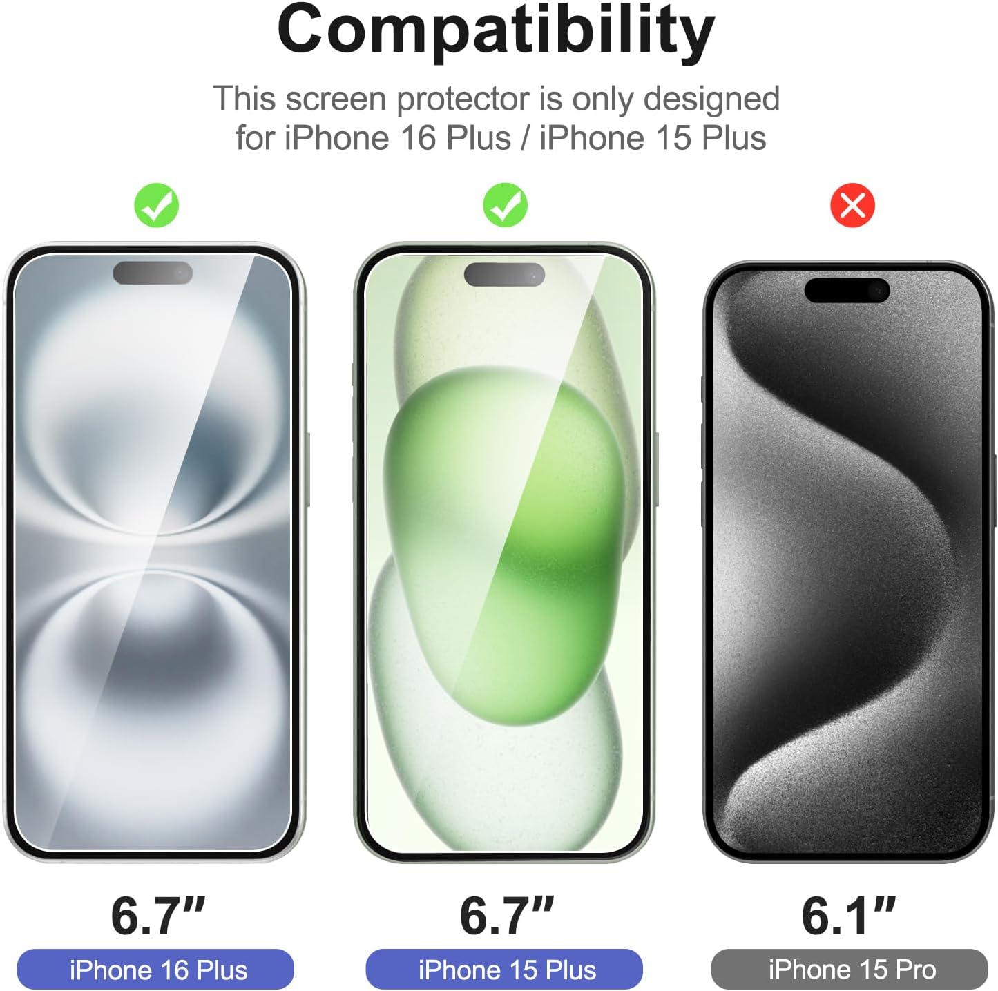 - Content: 3 Tempered Glass Screen Protectors for iPhone 16 Plus,15 Plus (6.7 inches) and an easy installation tool. 9H hardness, scratch resistance. Enhanced touch response and super transparency.