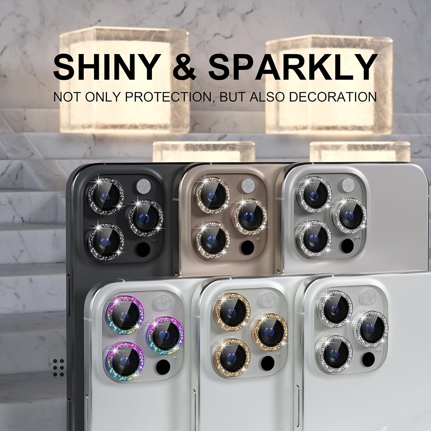 - Personalized Decoration: Made of high-quality aviation aluminum metal ring and 9H tempered glass and inlaid with bling rhinestones to give your 16 Pro/Pro Max camera lens a diamond gorgeous appearance, shining in the sun, very eye-catching and complimentary.