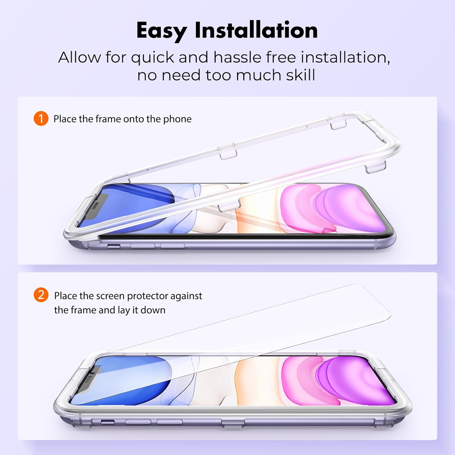 - 10s Super-easy Installation: The screen protector for iphone 11/XR includes all accessories necessary for a successful installation - 1 Installation frame, 3 alcohol wipes, 3 electrostatic dust removal stickers, 2 dust removal stickers, 1 microfiber cloth & detailed installation guide. The installation frame enables perfect alignment of the best iPhone 11/XR glass screen protectors. You can successfully install this screen protector in 10 seconds, even with no previous experience.