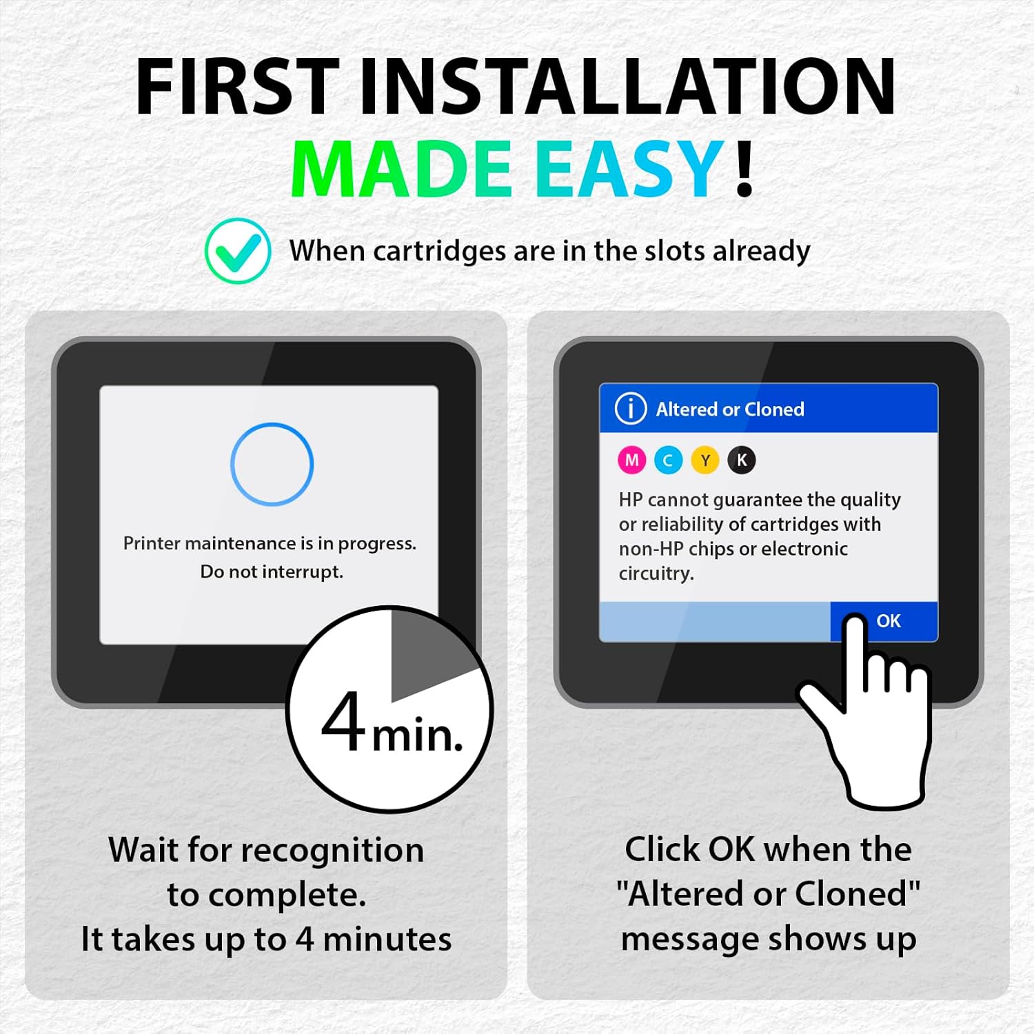 - Important: Expect a 4-minute recognition period during the first install of this replacement for HP 910XL printer ink cartridges. When the "Altered or Cloned" message appears, click OK to proceed printing on your HP 8015e printer or other models listed above