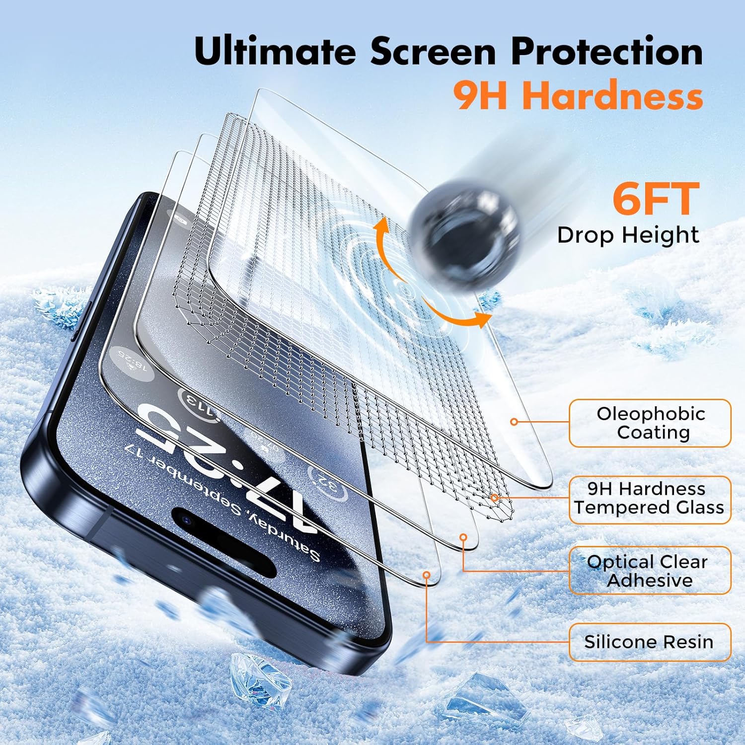 - [Double Protection]: This iPhone 15 Pro Max glass screen protector made from superior 9H tempered glass,reinforced to be twice as strong as other ordinary tempered films on the market, your screen would survive a drop from a height of 6 feet(1.8 meters).