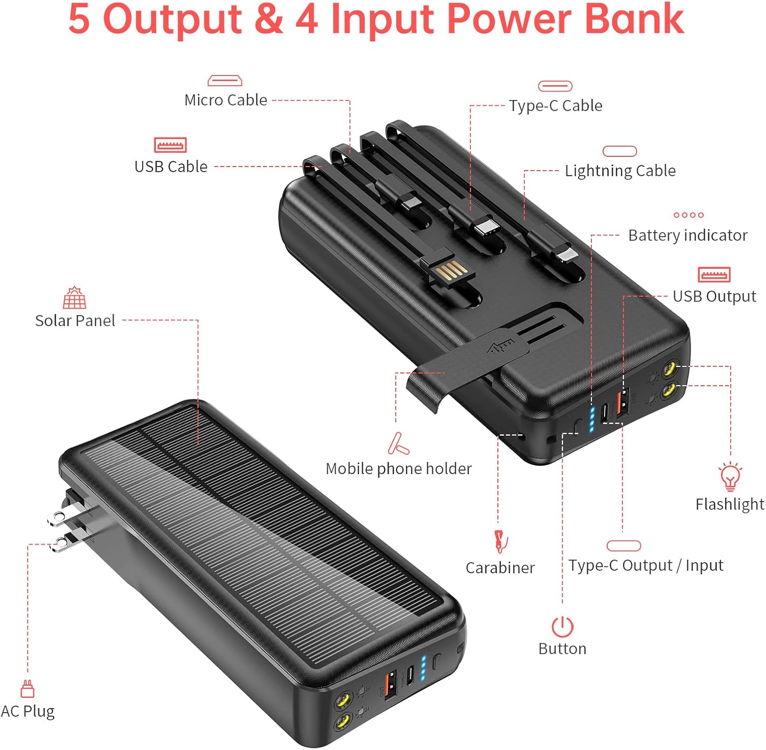 Portable Charger with Built in Cable and Wall Plug 50000mAh PD30W Fast Charging Solar Power Bank with 5 Output & 2 Input Dual LED Flashlights Phone Holder External Battery Pack (Black)