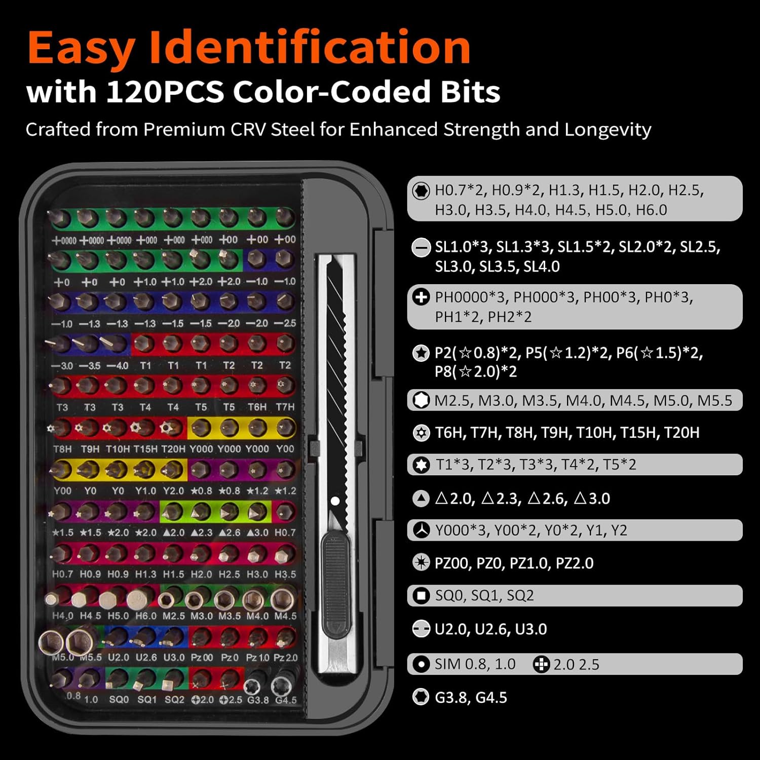 - Easy Identification with Color-Coded Bits: Each bit in the set is color-coded using advanced printing techniques, allowing for quick and easy identification. This thoughtful design helps you locate the right bit faster, reducing downtime and making your repair work more efficient. The vivid color coding remains clear and recognizable even after prolonged use.