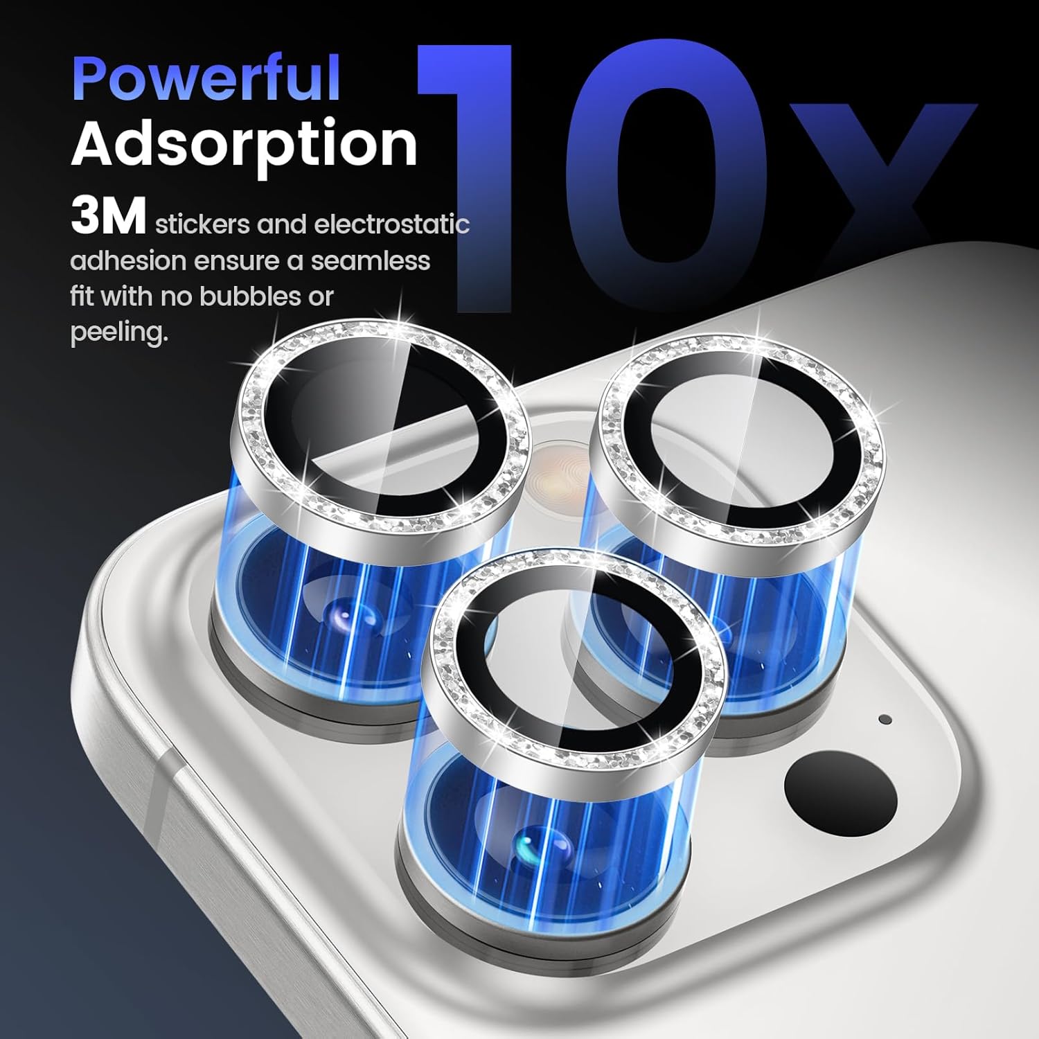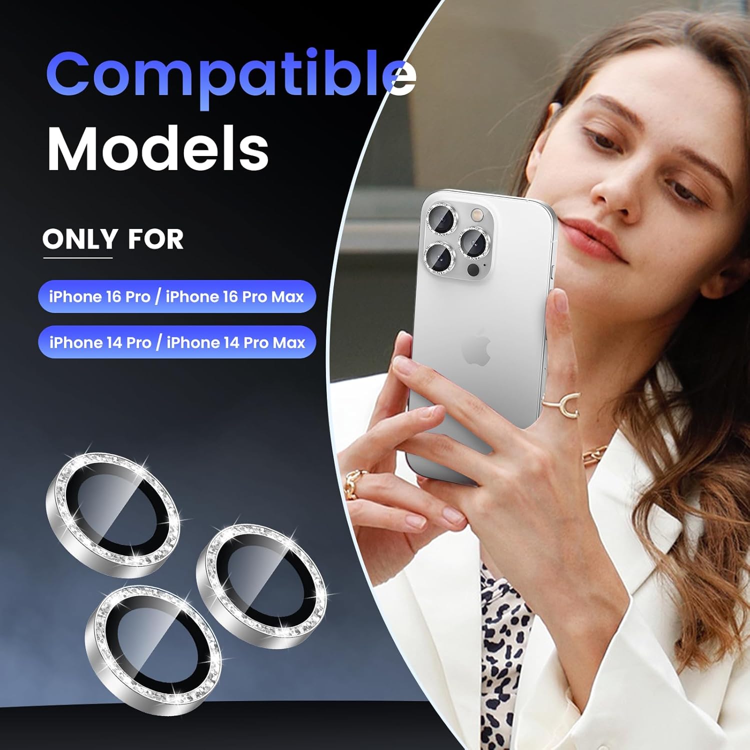 - Compatibility- Tensea rear rhinestone camera screen protector made by aviation aluminum and 9H tempered glass is designed for iPhone 16 Pro Max 6.9" / iPhone 16 Pro 6.3" / iPhone 14 Pro 6.1" / iPhone 14 Pro Max 6.7" with three camera. (Note: Not for iPhone 16/iPhone 16 Plus/iPhone 14/iPhone 14 Plus with two Camera) No bubbles, Case friendly, leave no residue after removed