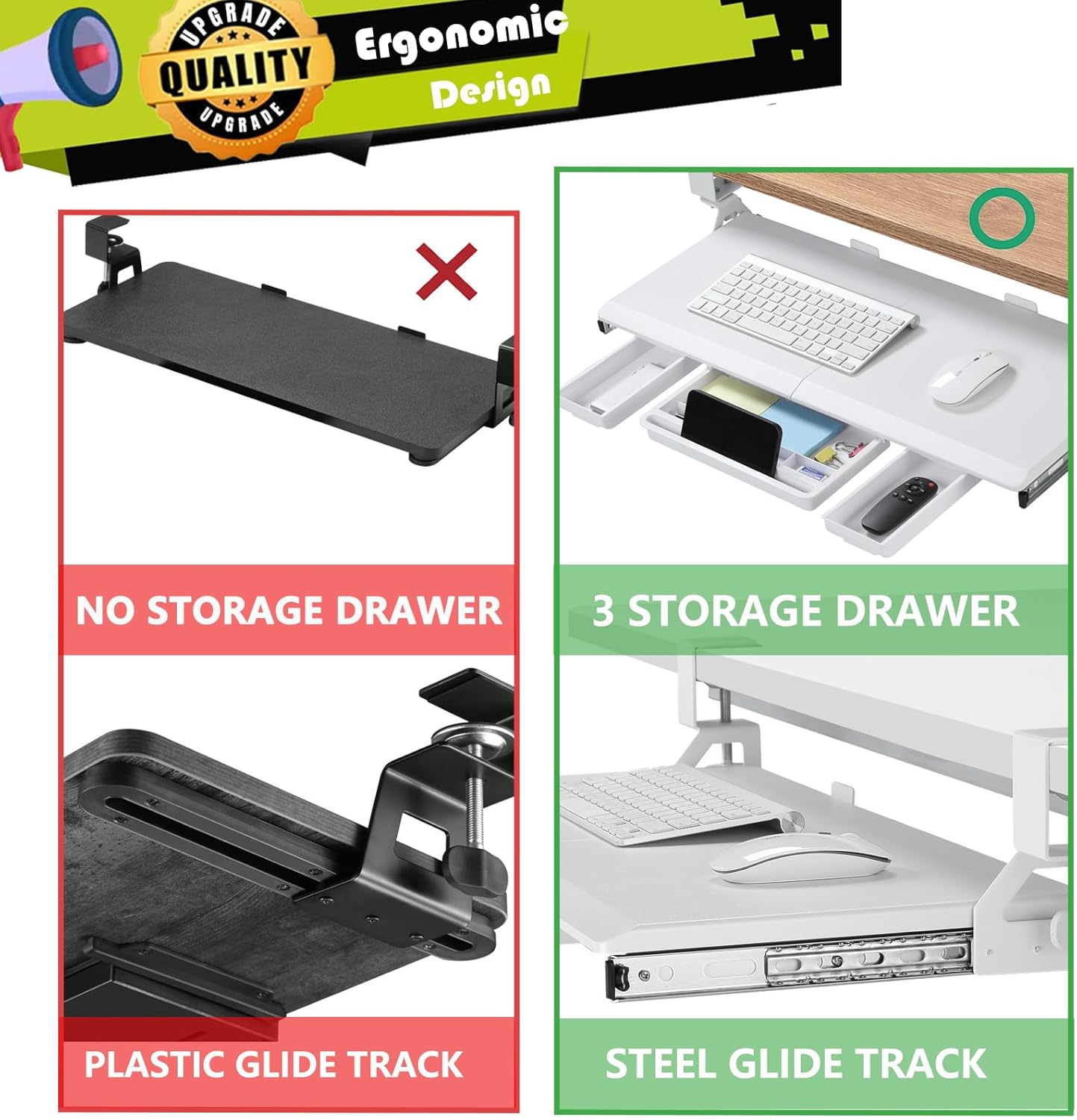 - ERGONOMIC KEYBOARD TRAY: It’s essential to have the right posture to protect your wrist, arms, neck, and shoulders when you’re at your desk. An under desk keyboard tray promotes an optimal typing position. It ensures you sit safely and can protect against neck and shoulder pain, wrist strain, and even RSI
